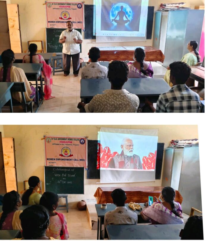 నేటి సాక్షి తిరుపతి (బాదూరు బాల)*వెదురుకుప్పం,* డిసెంబర్ 26, డా. వై.ఎస్.ఆర్. ప్రభుత్వ డిగ్రీ కళాశాల, వెదురుకుప్పంలో డిసెంబర్ 26, 2025న వీర్ బాల్ దివస్ కార్యక్రమాన్ని ఘనంగా నిర్వహించారు. ఈ కార్యక్రమాన్ని మహిళా సాధికారత సెల్ ఆధ్వర్యంలో దేశభక్తి భావాలతో నిర్వహించారు. యువ వీరుల త్యాగాలు, ధైర్యసాహసాలను స్మరించుకుంటూ విద్యార్థుల్లో దేశభక్తి, ధైర్యం, నైతిక విలువలను పెంపొందించడం ఈ కార్యక్రమం ప్రధాన ఉద్దేశ్యం.కార్యక్రమంలో కళాశాల ఉపప్రిన్సిపాల్ డా. బి.ఎల్. ప్రసన్నలత వీర్ బాల్ దివస్ ప్రాముఖ్యతను వివరిస్తూ విద్యార్థులు ధైర్యం, క్రమశిక్షణ, దేశసేవా భావనలను అలవరచుకోవాలని సూచించారు. డబ్ల్యూ ఈసి సమన్వయకర్త డా. ఎస్. రుష్మా* యువత దేశ నిర్మాణంలో కీలక పాత్ర పోషించాలని, వీర బాలల జీవితాల నుంచి స్ఫూర్తి పొందాలని విద్యార్థులను ప్రోత్సహించారు. కళాశాల ఫిజికల్ డైరెక్టర్ డా.ఎ సి భరణినాథ్ రెడ్డిశారీరక దృఢత్వం, మానసిక బలం, క్రమశిక్షణ ప్రాముఖ్యతపై ప్రసంగించారు.కంప్యూటర్ సైన్స్ అధ్యాపకులు ఎం. ఇస్మాయిల్ డిజిటల్ యుగంలో విద్యార్థులు బాధ్యతాయుతంగా వ్యవహరించాల్సిన అవసరాన్ని వివరించారు.ఈ సందర్భంగా డబ్ల్యూ ఈసి ఆధ్వర్యంలో నినాద రచన, ఫిట్నెస్ కార్యక్రమాలు, గ్రూప్ డిస్కషన్ తదితర పోటీలు నిర్వహించగా, విద్యార్థులు ఉత్సాహంగా పాల్గొని తమ ప్రతిభను ప్రదర్శించారు.కార్యక్రమం చివరలో విద్యార్థులు వీర బాలల ఆదర్శాలను తమ జీవితాల్లో అనుసరించాలని సంకల్పం చేసుకోవడంతో ఈ వేడుక విజయవంతంగా ముగిసింది. ఈ కార్యక్రమంలో విద్యార్థిని విద్యార్థులు, అధ్యాపక అధ్యాపకేత్ర బృందం పాల్గొన్నారు