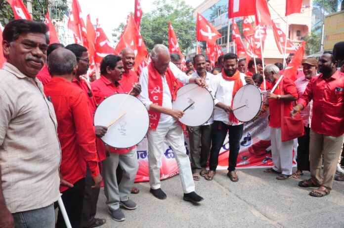 నేటి సాక్షి తిరుపతి (బాదూరు బాల)స్వాతంత్ర పోరాటం లో వీరోచిత పోరాటం చేసిన ఏకైక పార్టీ సిపిఐ అని స్పష్టం చేశారు. స్వాతంత్ర పోరాటం లో ఆర్ ఎస్ ఎస్ బ్రిటిష్ ప్రభుత్వానికి ఊడిగం చేశారు అని తీవ్రంగా విమర్శించారు. శుక్రవారం సిపిఐ శతాబ్ది శతాబ్ది ఉత్సవాల్లో భాగంగా తిరుపతి సిపిఐ నగర సమితి ఆధ్వర్యంలో బైరాగి పట్టెడ రాయలసీమ కాలేజీ నుండి రామానాయుడు స్కూల్, పద్మావతి పార్క్ మీదుగా సిపిఐ కార్యాలయం వరకు ర్యాలీ నిర్వహించారు. అనంతరం కే నారాయణ పార్టీ జెండాను ఆవిష్కరించారు. అమరవీరుల స్థూపానికి నివాళులు అర్పించారు. అనంతరం జె విశ్వనాథ్ అధ్యక్షత న జరిగిన బహిరంగ సభలో ఆయన మాట్లాడుతూ భూ పోరాటం లో లక్షలాది ఎకరాలు ఆక్రమించి పేదలకు పంచి పెట్టడం జరిగింది అన్నారు. చిత్తూరు నుండి శ్రీకాకుళం వరకు వేలాది మంది కి సాగు భూములు, ఇళ్ల స్థలాలు ఏ ఒక్క బూర్జువా పార్టీ ఒక్క సెంటు భూమి పంచలేదు అన్నారు. కానీ సిపిఐ భూ పోరాటం ద్వారా భూములు పంచి పెట్టడం జరిగింది అన్నారు. రాజకీయాలను ప్రభుత్వాలు భ్రష్టు పట్టిస్తున్నాయని విద్యార్థి సంఘాలకు ఎన్నికలు ఉన్నప్పుడు ఎంతో మంది రాజకీయ నాయకులు గా ఎదిగారు అన్నారు. విద్యార్థి సంఘాలకు ఎన్నికలు రద్దు చేసిన ఘనతా చంద్రబాబు కు దక్కింది అన్నారు. 10 లక్షల కోట్లు పేదల ఉపాధి కి ఖర్చు చేసిన కేంద్ర ప్రభుత్వం కార్పొరేట్ కంపెనీల కోసం 28 లక్షల కోట్లు మాఫీ చేశారు అని విమర్శించారు.ఉపాధి హామీ పథకం పేరు ఎందుకు మారుస్తున్నారూ. సమాధానం చెప్పాలి. దీన్ని చంద్రబాబు ఎందుకు ప్రశ్నించలేదు సమాధానం చెప్పాలి అన్నారు.రాష్ట్ర ప్రభుత్వాలను బెదిరిస్తూ బ్లాక్ మెయిల్ రాజకీయాలకు బీజేపీ పాల్పడుతోంది అన్నారు.హత్యలు, అరాచకాలు చేసిన వారికి కేంద్రం అండగా ఉండి అని, న్యాయ వ్యవస్థను సైతం తమ కనుసన్నల్లో నడిపిస్తున్నారు అన్నారు.పోరాడి సాధించుకున్న కార్మిక హక్కులను కలిసి నాలుగు లేబర్ కోడ్ లు గా మార్చివేశారు అన్నారు.ఉపాధి హామీ పథకం మార్చి వేస్తుంటే మద్దతు పలికి నేడు డిల్లీకి వెళ్లి కేంద్ర ప్రభుత్వం ను దేహి అని బిక్షం ఆడుకుంటున్నాడు అని ద్వజమెత్తారు.పారిశ్రామిక అభివృద్ధి కోసం విలువైన భూములను వేలాది ఎకరాలు బడాబాబుల అప్పగిస్తున్నారని విమర్శించారు.అడవుల్లో ఉన్న నక్సల్స్ ను చంపి గిరిజనులను తరిమివేసి అటవీ భూములను కార్పొరేట్ లకు అప్పగించేందుకు కుట్ర చేస్తున్నారని ఇది నిజమైన అభివృద్ధి కాదు అన్నారు.ప్రాథమిక హక్కులైన విద్య, వైద్యాన్ని ప్రవేటు కు అప్పగించడం గొర్రెను కసాయి కి అప్పగించినట్లే అన్నారు. సిపిఐ గడచిన పోరాటాల స్పూర్తి తో మతోన్మాద బిజెపి శక్తులపై పోరాటాలను ఉదృతం చేయాలని పిలుపును ఇచ్చారు. సిపిఐ రాష్ట్ర కార్యదర్శి వర్గ సభ్యులు పి హరినాథ్ 