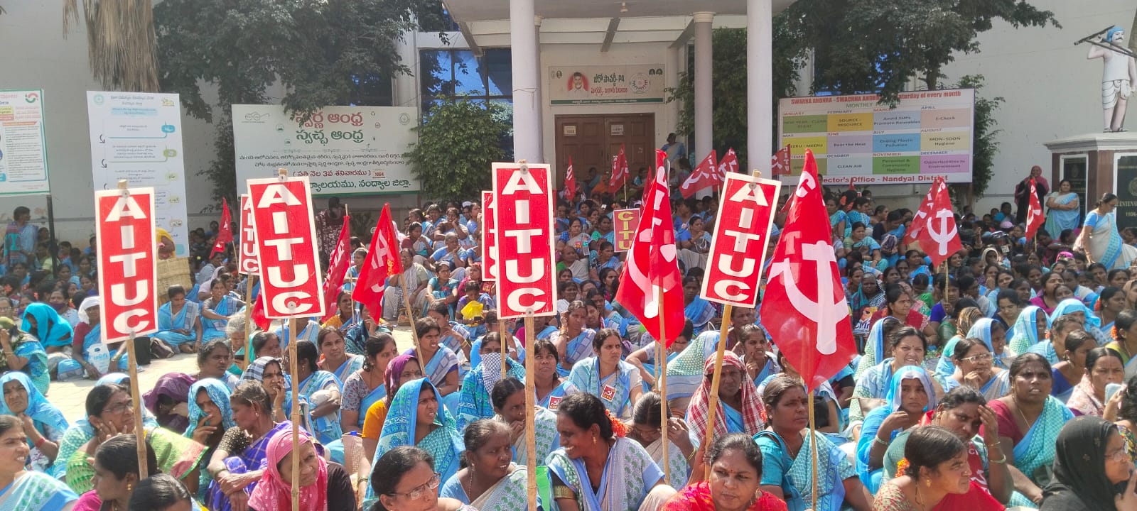 నేటి సాక్షి 12 నంద్యాల :—- గత వైసిపి ప్రభుత్వ హాయంలో అంగన్వాడీ కార్మికుల 42 రోజుల పాటు నిర్భంధాలను ఎదుర్కొని మెరుపు సమ్మె చేయడం జరిగిందని సమ్మె హామీల్లో ఇచ్చిన ఏ ఒక్క హామీని అధికారంలోకి వచ్చినా కూటమి ప్రభుత్వం అమలు చేయడం లేదని తక్షణమే సమ్మె కాలపు హామీలు అమలు చేయాలని, లేనిపక్షంలో అసెంబ్లీ ముట్టడికి పిలుపునిస్తామని *ఏఐటియుసి రాష్ట్ర కార్యదర్శి ఎం.రమేష్ బాబు ఏఐటీయూసీ జిల్లా కార్యదర్శి పి.సుంకయ్య సిఐటియు జిల్లా అధ్యక్షులు యేసు రత్నం లు పిలుపునిచ్చారు*.. శుక్రవారం రాష్ట్రవ్యాప్తంగా ఛలో కలెక్టరేట్ లో భాగంగా నంద్యాల కలెక్టర్ కార్యాలయాన్ని ఏఐటీయూసీ సీఐటీయూ సంఘాల జిల్లా నాయకులు జులేక,షేబా రాణి, ఆధ్వర్యంలో వందలాది మంది కలెక్టరేట్ ను ముట్టడించి విజయవంతం గా ఆందోళన నిర్వహించారు. ఈ కార్యక్రమానికి ముఖ్య అతిధిగా పాల్గొన్న ఏఐటీయూసీ రాష్ట్ర కార్యదర్శి ఎం. రమేష్ బాబు,ఏఐటీయూసీ జిల్లా కార్యదర్శి పి. సుంకయ్య సీఐటీయూ జిల్లా అధ్యక్షులు , యేసు రత్నం లు మాట్లాడుతు గత ప్రభుత్వం మాయమాటలు చెప్పి మోసపూరిత వాగ్దానాలతో అంగన్వాడీ కార్మికులను మోసం చేసిందని అందుకే ప్రభుత్వం కుప్ప కూలిపోయింది అన్నారు. కనీస వేతనం అమలు చేయడంలో విఫలం చెందిందని వారు విమర్శించారు.సమ్మె కాలం లో ప్రతిపక్షంలో ఉన్న టిడిపి ప్రభుత్వం మీకు అండగా ఉంటామని హామీ ఇచ్చి తీరా ప్రభుత్వం అధికారంలోకి వచ్చిన తర్వాత నట్టేట మంచి తడి గుడ్డతో గొంతు కోస్తున్నారన్నారు. వేతనాలు పెంపుదల చేస్తామని హామీ ఇచ్చారని నేడు మహిళ కార్మికులను విస్మరిస్తున్నారని వారన్నారు..తక్షణమే కనీస వేతనం ఈ ప్రభుత్వమైన అమలు చేయాలని వారు డిమాండ్ చేశారు. ప్రభుత్వం ఎందుకు హామీల అమలకు నోరు మెదపడం లేదని వారు ప్రశ్నించారు. పెండింగ్ లో ఉన్న మినీ వర్కర్లకు క్వాలిఫికేషన్ రిలాక్సేషన్ ఇచ్చి మెయిన్ సెంటర్ లుగా మార్చాలన్నారు. హెల్పర్ల ప్రమోషన్లకు నిర్దిష్టమైన గైడ్లైన్లు రూపొందించి అమలు చేయాలన్నారు. అంగన్వాడీ వర్కర్స్ కీ సంక్షేమ పథకాల అమలు చేసి అన్ని యాప్ లను కలిసి ఒకే యాఫ్ గా మార్చాలని, అంగన్వాడీ సెంటర్ నిర్వాహనకు 5జీ ఫోన్లు ఇవ్వాలన్నారు. గ్రాట్యూటీ అమలుకు గైడ్లైన్స్ రూపొందించి పెండింగ్లో ఉన్న సూపర్వైజర్ పోస్ట్ లను భర్తీ చేయాలని వారు డిమాండ్ చేశారు..పై డిమాండ్స్ తో పాటు గత సమ్మె కాలపు వాగ్దానాల అమలు చెయ్యాలని లేని పక్షంలో గత ప్రభుత్వానికి పట్టిన గతే ఈ ప్రభుత్వానికి పడుతుందని అంగన్వాడీ కార్మికులు తలుచుకుంటే ప్రభుత్వం పై దండ యాత్ర చేస్తామని అసెంబ్లీ ముట్టడిస్తామని వారు హెచ్చరించారు. ఈ కార్యక్రమంలో అంగన్వాడి వర్కర్స్ హెల్పర్స్ యూనియన్ ఏఐటియుసి సిఐటియు నంద్యాల జిల్లా నాయకులు వసుందర దేవి, సీత మహా 