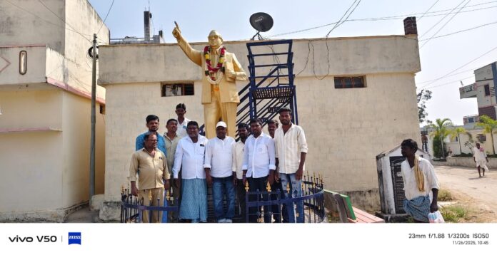 నేటి సాక్షి,నారాయణపేట, నవంబర్ 26,నారాయణపేట జిల్లాలోని ధన్వాడ మండల పరిధిలోని గోటూరు గ్రామంలో భారతరత్న డాక్టర్ బాబాసాహెబ్ అంబేద్కర్ గారు భారత రాజ్యాంగం నవంబర్ 26 -1949 అమల్లోకి వచ్చిన సందర్భంగా వారికి ఘనంగా నివాళులర్పించడం జరిగింది.దేశ ప్రజలందరికీ స్వేచ్ఛ సమానత్వం సౌభ్రతృత్వలను హక్కులను తెలియజేస్తూ రూపొందించిన భారత రాజ్యాంగం అమల్లోకి వచ్చిన విగ్రహానికి పూలమాలలతో ఘన సన్మాన కార్యక్రమం నిర్వహించడం జరిగింది. ఈ కార్యక్రమంలోబి..ఎస్.పి నారాయణపేట జిల్లా అధ్యక్షులు* భోదిగల శ్రీనివాస్, మాజీ ఎంపీటీసీ కే.బాలరాజ్ అంబేద్కర్ యువజన సంఘం వ్యవస్థాపక అధ్యక్షులు సుక్కల రాజ్ కుమార్ సంఘ సభ్యులు పి రాజేష్ కుమార్, పి శ్రీను యాసిన్ ఖాన్, జి రామాంజనేయులు, జి కృష్ణ బి శ్రీకాంత్, తదితరులు పాల్గొన్నారు.