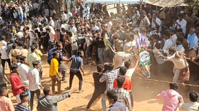 *అనుప్పల్లిలో హోరెత్తించిన ఊజల్లికట్టు* *రంకులేసి దుమ్ము రేపిన కోడె గిత్తలు..**కోడె గిత్తలకుపట్టీల కోసం యువకులకు కుస్తీ ..**తమ అభిమాన నాయకుల ఫోటోలతో పట్టీలు సొంతం చేసుకునే క్రమంలో పలువురికి స్వల్ప గాయాలు..*