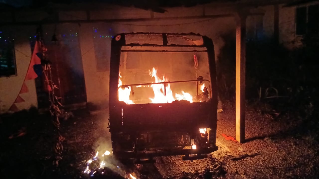 నేటి సాక్షి నల్లబెల్లి ప్రతినిధి అక్టోబర్ 25 : నల్లబెల్లి మండలం ముచింపుల గ్రామంలో అర్ధరాత్రి అనుమాదాస్పద రీతిలో ఒక ఆటో అగ్నిప్రమాదానికి గురైంది. మచ్చిక మహేష్ అనే ఆటో డ్రైవర్ శుక్రవారం సాయంత్రం సుమారు రాత్రి 11 గంటల సమయంలో రోజు కిరాయిలు కొట్టే విధంగానే నడుపుకుంటూ వచ్చి ముచ్చింపుల గ్రామంలో తన ఇంటి పక్కన ఉన్న హనుమాన్ గుడి ముందువున్నా రేకుల కింద నిలిపాడు. శనివారం తెల్లవారుజామున 3 గంటల సమయంలో భారీ మంటలు , పొగ రావడం చూసిన చుట్టుపక్కల ఉన్న స్థానికులు ఆటో కాల్తోందంటూ మహేష్ కు ఫోన్ చేసి తెలపగా వెంటనే వచ్చిన మహేష్ చుట్టుపక్కల ఉన్న స్థానికుల సహాయంతో బడ్జెట్లతో నీళ్లు చల్లడంతో మంటలను అర్పినప్పటికీ ఆటో మొత్తం దగ్ధమైనట్టు, బ్యాటరీ వేడికి షార్ట్ సర్క్యూట్ అయిందనుకుంటూ.ఈ ఘటనపై బాధిత మహేష్ పోలీస్ స్టేషన్లో ఫిర్యాదు చేశారు.