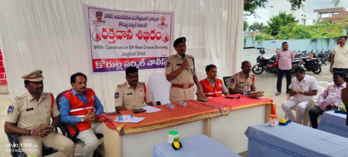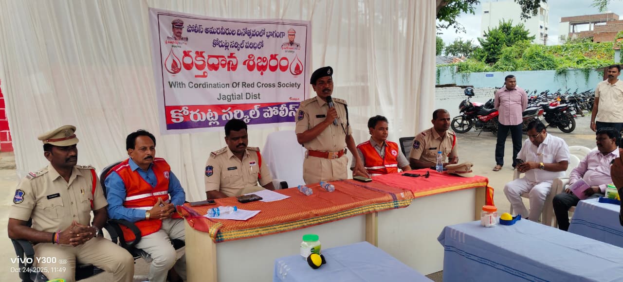 నేటి సాక్షి – కోరుట్ల*( రాధారపు నర్సయ్య )పోలీస్ అమరవీరుల సంస్మరణ వారోత్సవం సందర్భంగా జగిత్యాల జిల్లా పోలీస్ శాఖ ఆధ్వర్యంలో ‘మెగా రక్తదాన శిబిరం’ రికార్డు స్థాయిలో ఘనంగా జరిగింది. జిల్లా ఎస్పీ అశోక్ కుమార్ ఆదేశాల మేరకు కోరుట్ల సర్కిల్ పోలీసుల ఆధ్వర్యంలో, ఇండియన్ రెడ్ క్రాస్ బ్లడ్ బ్యాంక్ సహకారంతో కోరుట్ల పోలీస్ స్టేషన్ ప్రాంగణంలో ఈ శిబిరం ఏర్పాటు చేశారు.మెట్ పల్లి డీఎస్పీ రాములు ఈ రక్తదాన శిబిరాన్ని ప్రారంభించి, మొదటి రక్తదాతకు పండ్లు అందజేశారు. పోలీసులు, స్థానిక యువత, వ్యాపారస్తులు, రెడ్ క్రాస్ సభ్యులు కలిసి సుమారు 100 యూనిట్ల రక్తం దానం చేశారు.*అమరవీరుల త్యాగాలు మరువలేనివి*ఈ సందర్భంగా డీఎస్పీ రాములు మాట్లాడుతూ..“దేశ శాంతి భద్రతల కోసం ప్రాణాలు అర్పించిన పోలీస్ అమరవీరులను స్మరించుకోవడం మనందరి బాధ్యత. వారి త్యాగాలకు నిజమైన నివాళి రక్తదానం వంటి సేవా కార్యక్రమాల ద్వారానే ఉంటుంద’ని పేర్కొన్నారు.అలాగే, “ప్రతి మూడు నెలలకు ఒకసారి రక్తదానం చేయడం ద్వారా ఆరోగ్యంగా ఉండడమే కాక, ఆపదలో ఉన్నవారికి ప్రాణదాతలమవుతామ’ని తెలిపారు.ఈకార్యక్రమంలో కోరుట్ల సర్కిల్ ఇన్స్పెక్టర్ సురేష్, ఎస్ఐలు చిరంజీవి, శ్రీధర్ రెడ్డి, జిల్లా ఇండియన్ రెడ్ క్రాస్ సొసైటీ కార్యదర్శి మంచాల కృష్ణ, సభ్యులు సిరిసిల్ల శ్రీనివాస్, పోలీస్ సిబ్బంది, స్థానికులు పాల్గొన్నారు._____