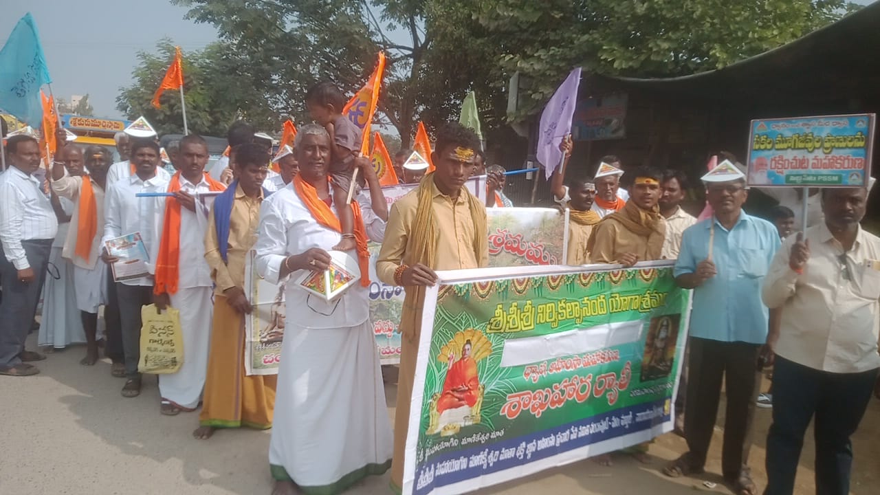 నేటి సాక్షి, నారాయణపేట, ఫిబ్రవరి 1, ( రిపోర్టర్ ఇమామ్ సాబ్),ఎందరో యోగులు, మహాత్ములు ఆచరించి అందించిన అహింసా మార్గంలో జీవించాలని ధ్యాన శాకాహార ప్రచార కార్యదర్శి బంగ్లా ఆంజనేయరెడ్డి,శివరాములు, హుస్సేనయ్య అన్నారు. మాత మాణిక్యేశ్వరి, బ్రహ్మర్షి పితామహా పత్రీజీ, తమ చివరి క్షణం వరకు శాఖాహారం గురించి ప్రబోధించి ఎందరినో శాకాహారులుగా మార్చారని వారు అన్నారు. ఆదివారం నాడు మరికల్ పట్టణంలో మాణిక్యేశ్వరి ట్రస్ట్, పిరమిడ్ స్పిరిచువల్ సొసైటీ ఆధ్వర్యంలో మహా కరుణ అహింసా శాకాహార ర్యాలీని నిర్వహించారు. ఈ సందర్భంగా ప్రధాన కూడలిలో వారు మాట్లాడుతూ గాంధీజీ, అంబేద్కర్, ఆదిశంకరాచార్య, బుద్ధుడు, పాటించిన అహింసా మార్గంలో నడుచుకోవాలని వారు అన్నారు. వేదాలు ఉపనిషత్తులు భగవద్గీతలో కూడా అహింసా మార్గం గురించి వివరించి ఉన్నదని వారు అన్నారు. ఉమ్మడి జిల్లాలోని వివిధ ప్రాంతాల నుంచి వచ్చిన ధ్యానులు శాకాహారులు ఈ ర్యాలీలో పాల్గొంటూ పలు నినాదాలు చేశారు. శాఖాహారం ముద్దు మాంసాహారం వద్దు,, జీవహింస మహాపాపం, అహింసో పరమోధర్మః, ఏ జీవిని చంపే హక్కు ఎవరికీ లేదు, శాఖాహారం అమృతహారం, మాంసం తింటే ఎనిమిది రకాల పాపాలు, పట్టణ పురవీధుల్లో ఈ ర్యాలీని నిర్వహించారు. శాకాహారం తీసుకుంటూ ధ్యానం చేయడం ద్వారా, తాము పొందిన లాభాల గురించి పలువురు తమ అనుభవాలను ప్రజలకు తెలియజేశారు. పాటల రూపంలో అవగాహన కల్పించారు. ఈ కార్యక్రమంలో, సాయప్ప, బాలకృష్ణా రెడ్డి రగొట్టం ఆర్యా, గాంధీ మణెమ్మ, శివరాములు, చెన్నారెడ్డి, కనకప్ప, భీమేష్, తిరుపతయ్య, ప్రవీణ్, వెంకటేష్, సత్యనారాయణరెడ్డి, తదితరులు పాల్గొన్నారు.