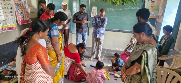 ఫోటో రైటప్: 10 RKL02: అంగన్వాడీ కేంద్రంలో పిల్లల సామర్థ్యాలను పరిశీలిస్తున్న దృశ్యం