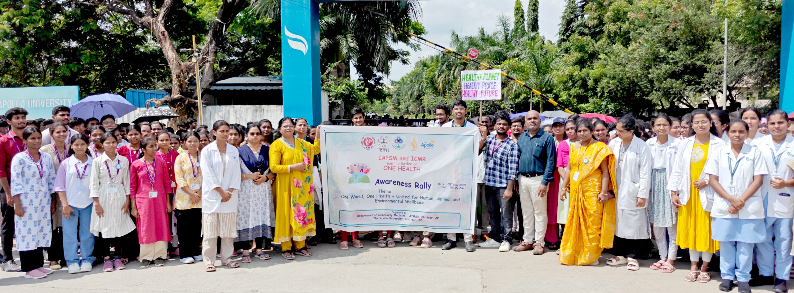 నేటి సాక్షి తిరుపతి (బాదూరు బాల)చిత్తూరు, నవంబర్‌ 5: “ఒక ప్రపంచం – ఒక ఆరోగ్యం అన్న సమగ్ర నినాదంతో అపోలో ఇన్‌స్టిట్యూట్ ఆఫ్ మెడికల్ సైన్సెస్ అండ్ రీసెర్చ్ఓ (ఏఐఎంఎస్‌ఆర్‌), ది అపోలో యూనివర్శిటీ సంయుక్తంగా బుధవారం అవగాహన ర్యాలీని ఘనంగా నిర్వహించాయి.ఇండియన్ అసోసియేషన్ ఆఫ్ ప్రివెంటివ్ అండ్ సోషియల్ మెడిసిన్ (ఐఏపీఎస్‌ఎమ్‌), ఇండియన్ కౌన్సిల్ ఆఫ్ మెడికల్ రీసెర్చ్ (ఐసిఎంఆర్‌) సంస్థల సహకారంతో జరిగిన ఈ ర్యాలీ ద్వారా మానవుడు – జంతువు – పర్యావరణం అనే త్రిసంబంధ ఆరోగ్య భావనను ప్రజలకు చాటిచెప్పారు.డిపార్ట్‌మెంట్ ఆఫ్ కమ్యూనిటీ మెడిసిన్‌ ఆధ్వర్యంలో జరిగిన ఈ ర్యాలీ ఏఐఎంఎస్‌ఆర్‌ పరిపాలనా భవనం వద్ద ప్రారంభమై మురకంబట్టు సర్కిల్‌ వరకు సాగింది. విద్యార్థులు ఆరోగ్య చైతన్య నినాదాలు చేస్తూ, ప్లేకార్డులు, ఫ్లెక్సీలు పట్టుకొని ర్యాలీలో పాల్గొన్నారు. ఈ సందర్భంగా మురకంబట్టు సర్కిల్‌లో విద్యార్థులు “మానవ హారం”గా నిలబడి మానవుడు–జంతువు–పర్యావరణం పరస్పర అనుసంధానం ద్వారానే స్థిరమైన ఆరోగ్య సమాజం సాధ్యమని స్పష్టం చేశారు. అనంతరం విద్యార్థులు ప్రదర్శించిన వీధి నాటకం ప్రేక్షకులను ఆకట్టుకుంది. పర్యావరణ పరిరక్షణ, ప్రజా ఆరోగ్యం, పరిశుభ్రత, జీవ వైవిధ్య పరిరక్షణ అంశాలపై సందేశాత్మకంగా రూపొందించిన ఈ నాటిక ప్రజల్లో చైతన్యం కలిగించింది.ఈ సందర్భంగా వక్తలు మాట్లాడుతూ — “మానవ ఆరోగ్యాన్ని కాపాడాలంటే ప్రకృతితో సమతుల్యత తప్పనిసరి. పర్యావరణం, జంతువులు, మనుషుల ఆరోగ్యం ఒకదానితో మరొకటి ముడిపడి ఉన్నాయి. ఈ భావనతో ముందుకు సాగితేనే ఆరోగ్యకరమైన సమాజం నిర్మాణం సాధ్యం” అని పేర్కొన్నారు.కార్యక్రమంలో కమ్యూనిటీ మెడిసిన్ విభాగాధిపతి ప్రొఫెసర్‌ డా. కె. అశోక్ కుమార్ రెడ్డి, నోడల్‌ ఆఫీసర్‌, అసోసియేట్‌ ప్రొఫెసర్‌ డా. దేవికా పి.జె, అపోలో ఫిజియోథెరపీ కాలేజీ ప్రిన్సిపల్‌ డా. కిరణ్‌, అలాగే వైద్య విద్యార్థులు, పోస్ట్‌ గ్రాడ్యుయేట్లు, సీనియర్‌ రెసిడెంట్లు, నర్సింగ్‌, ఫిజియోథెరపీ, అలైడ్‌ హెల్త్‌ సైన్సెస్‌, పబ్లిక్‌ హెల్త్‌, అపోలో సోషల్‌ రెస్పాన్సిబిలిటీ క్లబ్‌, ఎకో క్లబ్‌ సభ్యులు పెద్ద సంఖ్యలో పాల్గొన్నారు.