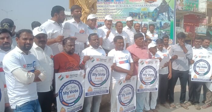 నేటి సాక్షి, డిజిటల్ న్యూస్, జనవరి 25,( రిపోర్టర్ ఇమామ్ సాబ్), గ్రామాలలో ఉండే 18 ఏళ్లు నిండిన ప్రతి ఒక్కరు ఓటు హక్కును సద్వినియోగం చేసుకోవాలని మరికల్ మండల తాసిల్దార్ రామకోటి అన్నారు ఆదివారం నాడు మరికల్ మండల కేంద్రంలో ఉద్యోగస్తుల విద్యార్థుల ఆధ్వర్యంలో జాతీయ ఓటర్ దినోత్సవం పురస్కరించుకొని మరికల్ గ్రామంలోని ప్రతి వార్డులలో ర్యాలీ కార్యక్రమాన్ని నిర్వహించారు. అనంతరం ప్రజలను ఉద్దేశించి మరికల్ మండల తాసిల్దార్ రామకోటి మాట్లాడుతూ గ్రామీణ ప్రాంతాల్లో 18 సంవత్సరాలు నిండిన వారు ఓటు హక్కు కోసం దరఖాస్తు చేసుకోవాలని ఆయన. మనిషికి ఒక ఆయుధమని ఆయన వివరించారు. జాతీయ ఓటర్ దినోత్సవం పురస్కరించుకొని ర్యాలీలో పాల్గొన్న ప్రతి ఒక్కరికి తాసిల్దార్ కృతజ్ఞతలు తెలిపారు. అనంతరం గ్రామంలో ఉన్న సీనియర్ ఓటర్కు శాలువాతో సన్మానించారు. మరికల్ గ్రామ సర్పంచ్ చెన్నయ్య ఉపసర్పంచ్ కాజా, మరికల్ మండల కాంగ్రెస్ పార్టీ అధ్యక్షులు వీరన్న,మరికల్ పట్టణ కాంగ్రెస్ పార్టీ అధ్యక్షులు హరీష్ కుమార్, వివిధ శాఖల అధికారులు ప్రభుత్వ పాఠశాల విద్యార్థులు ప్రైవేటు పాఠశాల విద్యార్థులు, మణికంఠ జూనియర్ కళాశాల యువకులు, వార్డు సభ్యుల,సురిటి చంద్రశేఖర్, వివిధ శాఖల అధికారులు తదితరులు పాల్గొన్నారు.
