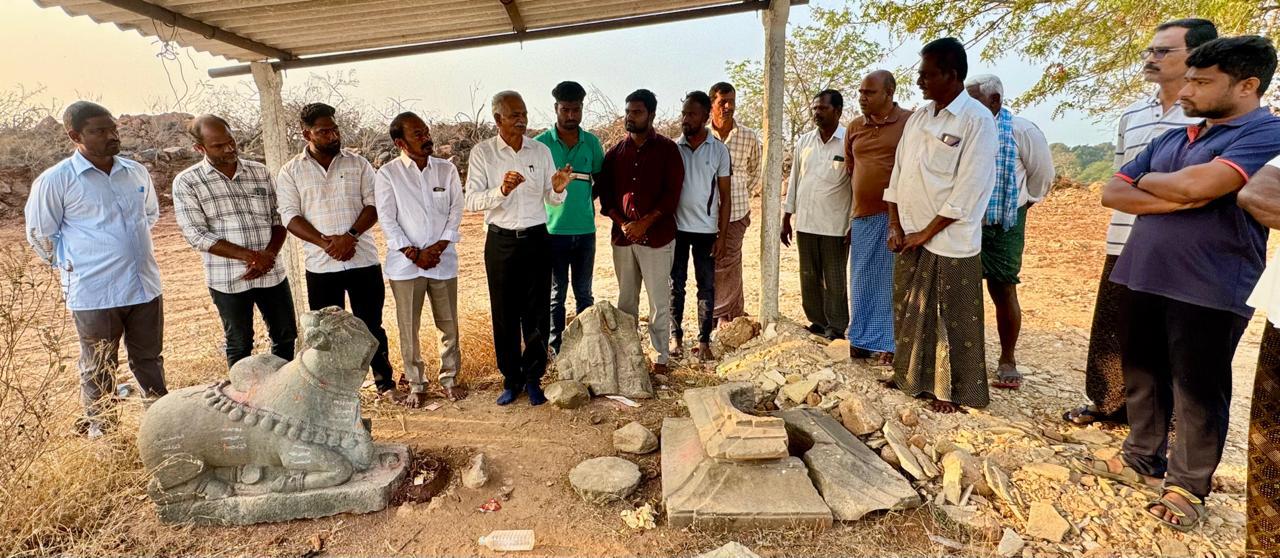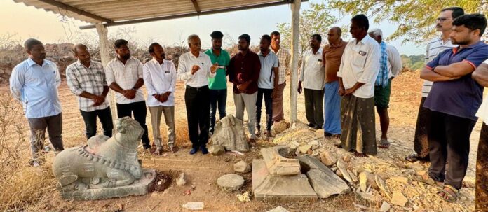 నేటిసాక్షి, మిర్యాలగూడ : నియోజకవర్గ పరిధిలోని దామరచర్ల మండలం బొత్తలపాలెం గ్రామ శివారులోనున్న నందిబోడు పైన కాకతీయుల కాలం (క్రీ.శ.13వ శతాబ్దం) నాటి శిధిల శివాలయం, భిన్నమైన శివలింగం, నంది, చెన్నకేశవ శిల్పాలను కాపాడుకోవాలని పురావస్తు పరిశోధకుడు, ప్లీచ్ ఇండియా ఫౌండేషన్, సీఈవో, డా. ఈమని శివనాగిరెడ్డి అన్నారు. గ్రామ సర్పంచ్ ఇంజం నర్సిరెడ్డి ఇచ్చిన సమాచారం మేరకు, వారి ఆధ్వర్యంలో ఆయన శనివారం నందిబోడ్ పైనున్న శిల్పాలను గ్రామస్తుల సమక్షంలో పరిశీలించారు. ఈ సందర్భంగా ఆయన మాట్లాడుతూ, శివాలయంలో చెట్లు, పుట్టలు పెరిగి, గోడలు పడిపోయాయని, ఆలయ వెనకవైపు నిర్మించిన తాత్కాలిక రేకు షెడ్డు కింద కాకతీయుల శైలి ఉట్టిపడుతున్న శివలింగం పానపట్టము, ముట్టె, చెవులు భిన్నమైన నంది, తల, కాళ్లు లేని అందంగా అలంకరించిన శ్రీదేవి, భూదేవి సహిత చెన్నకేశవ విగ్రహాలు క్రీ.శ. 700 సంవత్సరాల నాటి బొత్తలపాలెం గ్రామ చరిత్రకు ఆనవాళ్ళని, వాటిని కాపాడుకొని, భవిష్యత్తరాలు అందించాలని శివనాగిరెడ్డి గ్రామస్తులకు విజ్ఞప్తి చేశారు. ఈ కార్యక్రమంలో ఉపసర్పంచ్ నర్సింగ్ అనిల్, గ్రామ పెద్దలు పగిడిపాటి శ్రీనివాస్ రెడ్డి, వీరారెడ్డి, రవీందర్ రెడ్డి, కందుల బిక్షారెడ్డి, పలసాని రామ్ రెడ్డి, పోటుపల్లి బాబు, ఉదయ్, సిరసాల సైదులు, నామా రవీందర్, ఆకారపు గోపాల్, మునగాల వెంకటరెడ్డి, ఇంకా శిల్పి బి. వెంకటరెడ్డి, పింగళి వెంకట నాగప్రసాద్ పాల్గొన్నారని శివనాగిరెడ్డి చెప్పారు.