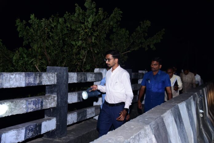నేటి సాక్షి, బాపట్ల జిల్లా, (చీరాల)నీటి ప్రవాహ తగ్గిన తర్వాత కుందేరు వాగు డ్రైనేజీ పనులు చేపట్టాలని జిల్లా కలెక్టర్ డాక్టర్ వి.వినోద్ కుమార్ పేర్కొన్నారు.శనివారం రాత్రి చీరాల – బాపట్ల మధ్య లో ఉన్న కుందేరు వాగును చీరాల ఆర్డీఓ తో కలసి జిల్లా కలెక్టర్ పరిశీలించారు.తదుపరి జిల్లా కలెక్టర్ డాక్టర్ వి.వినోద్ కుమార్ అధికారులతో మాట్లాడుతు కుందేరు వాగులలో నీటి ప్రవాహం తగ్గిన తర్వాత డ్రెనేజి నిర్మాణాల చేపట్టాలని మురుగునీటి (జలవనరుల)శాఖ అధికారులను కలెక్టర్ ఆదేశించారు. వర్షాల వల్ల ఎక్కువ నీరు రావడంతో నీరు సంక్రాంగా వెళ్ళాక పోవడంతో గట్టు తెగిపోవడం వల్ల నీరు పొలాలలోకి వెళ్లడంతో రైతులు నష్టపోవడం జరుగుతుందని తెలిపారు, నీటి ప్రవాహం తగ్గిన వెంటనే డ్రైన్ పనులు చేపట్టాలని సంభందిత అధికారులను ఆదేశించారు.జిల్లా కలెక్టర్ వెంట చీరాల ఆర్డీఓ,చంద్రశేఖర్ నాయుడు,తహశీల్దార్ గోపి కృష్ణ, జలవనరుల శాఖ అధికారులు తదితరులు ఉన్నారు.