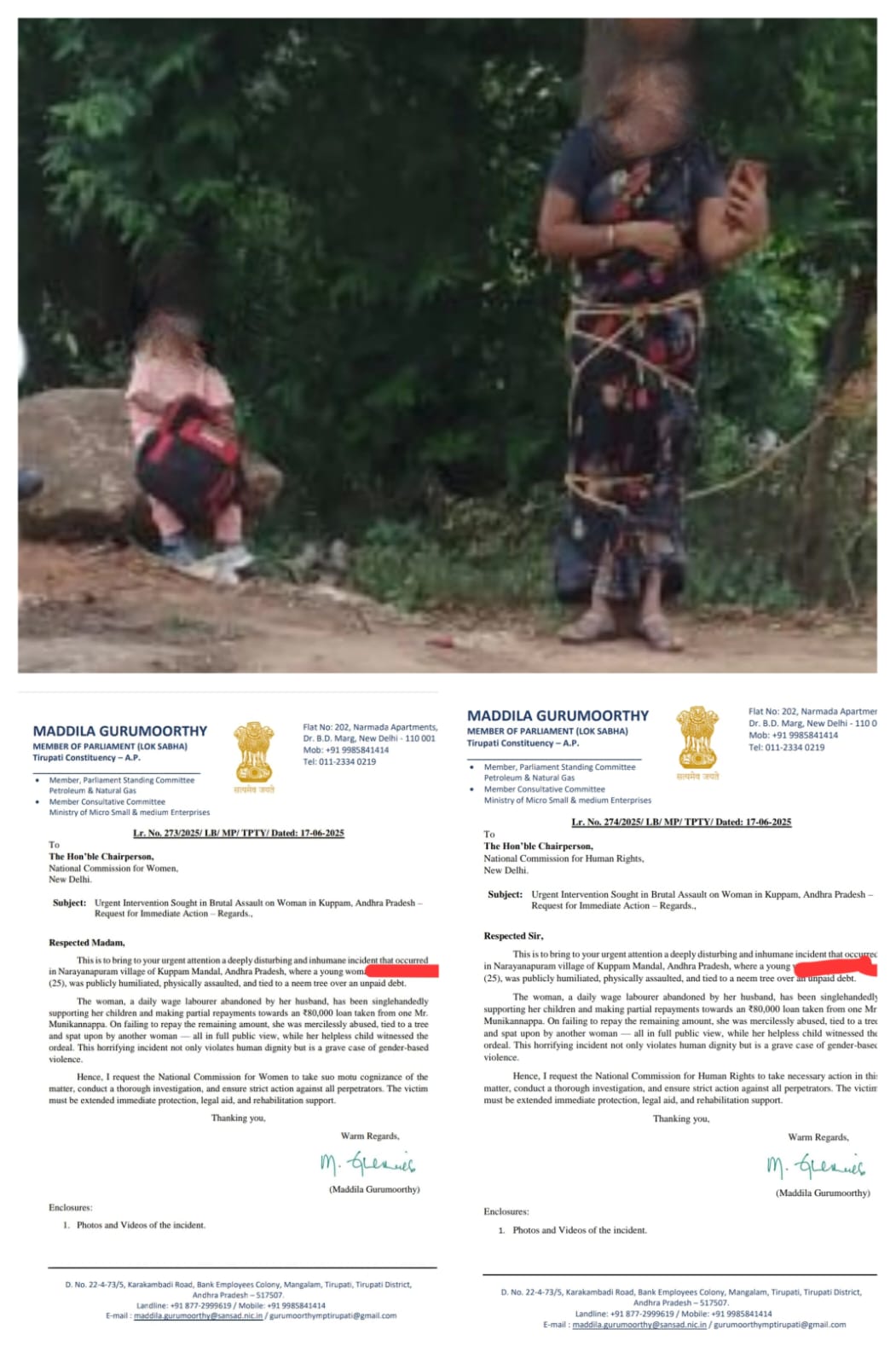 నేటి సాక్షి తిరుపతి: జిల్లా (బాదూరు బాల) కుప్పం నియోజకవర్గం లో జరిగిన ఈ ఆటవిక, అనాగరిక సంఘటనకు బాధ్యులైన వారిని కఠినంగా శిక్షించాలని వైఎస్సార్ కాంగ్రెస్ పార్టీ అధ్యక్షులు, మాజీ ముఖ్యమంత్రి వైస్ జగన్ మోహన్ రెడ్డి ఆదేశాల మేరకు వైసీపీ ఎంపీలు మద్దిల గురుమూర్తి, గుమ్మా తనూజ రాణి జాతీయ మహిళా కమిషన్, జాతీయ మానవహక్కుల కమిషన్ కి ఫిర్యాదు చేశారు. ఎంపీ గురుమూర్తి మాట్లాడుతూ అప్పు కట్టలేదని ఒక తల్లిని తన కన్న కొడుకు ఎదుటే చెట్టుకు కట్టేసిన సంఘటన తీవ్రంగా కలచివేసిందని విచారం వ్యక్తం చేశారు. అది ముఖ్యమంత్రి స్వయాన స్వంత నియోజకవర్గం కుప్పంలోనే ఇలా జరగడం శోచనీయమన్నారు. ఈ ఘటనపై విచారణ జరిపి బాద్యులపై కఠిన చర్యలు తీసుకోవాలని కోరినట్లు ఎంపీ తెలిపారు.*