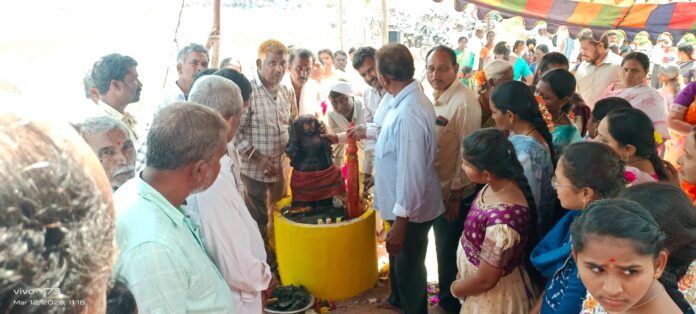 *నేటిసాక్షి న్యూస్* తిరుమలాయపాలెం మార్చి 12 (మెట్టు రుద్రరాజు)మండల పరిధిలోని కొక్కిరేణి గ్రామంలో గురువారం ఘనంగా కట్ట మైసమ్మ పోతురాజు విగ్రహాల ప్రతిష్ట కార్యక్రమం ఎంతో అంగరంగ వైభవంగా నిర్వహించారు గ్రామం లోని పెద్ద చెరువు కట్టపై నూతనంగా గ్రామస్తుల సహకారంతో నిర్మించిన గుడి లో కట్ట మైసమ్మ ఎదురుగా పోతురాజు విగ్రహాలను వేద పండితుల చేతుల మీదుగా వేదమంత్రాల తో మంగళ వాయిద్యాల మధ్య గ్రామస్తుల అందరి సమక్షంలో విగ్రహాలను ప్రతిష్టించారు. ఈ సందర్భంగా గ్రామ సర్పంచ్ కర్నాటి రాజేంద్రప్రసాద్ కుటుంబ సమేతంగా హాజరై విగ్రహ ప్రతిష్టను తిలకించి ప్రత్యేక పూజలు నిర్వహించారు. కొక్కిరేణి గ్రామానికి చెందిన మల్లెల వెంకటేశ్వర్లు.. భాగ్యమ్మ ఎలకొండ సాంబయ్య … పద్మ గంట కృష్ణ నిర్మల దంపతులు పీటల మీద కూర్చొని ప్రత్యేక పూజలు నిర్వహించారు. గ్రామస్తులంతా సుభిక్షంగా ఆయురారోగ్యాలతో అష్టైశ్వర్యాలతో పాడిపంటలతో ఉండాలని గ్రామ ప్రజలందరినీ కట్టమైసమ్మ తల్లి పోతురాజు దీవెనలు ఉండాలని వారు అమ్మవారిని కోరారు. ఈ కార్యక్రమం లో గ్రామ సర్పంచ్ కర్నాటి రాజేంద్రప్రసాద్ మాజీ జెడ్పిటిసి ఎల్లకొండ నాగేశ్వరరావు చావా వెంకట్రావు నంబూరు శేషు గద్దల నాగేశ్వరరావు చావా రాజేష్ సిరి గద్దె ఉపేందర్ గుగ్గిళ్ళ అంబేద్కర్ ఏలూరి వెంకట్రావు ఉలవ వీరభద్రం ఎలకొండ బుచ్చయ్య గద్దల మధు ఊడుగు ఉపేందర్ గుగ్గిళ్ళ అశోక్ తదితరులు పాల్గొన్నారు