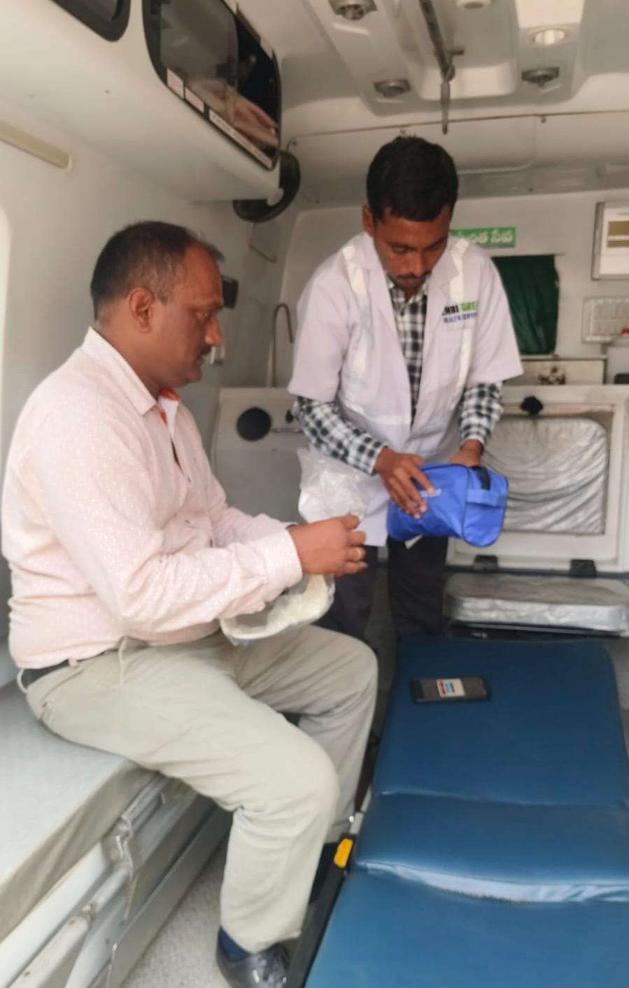 నేటి సాక్షి, ధర్మారం (జనవరి 20) : అత్యవసర సమయంలో ఉన్న క్షతగాత్రులకు సత్వర సేవలు అందించాలని 108 అంబులెన్స్ పెద్దపల్లి జిల్లా మేనేజర్ జంపాల కుమారస్వామి పేర్కొన్నారు. మంగళవారం పెద్దపల్లి జిల్లా ధర్మారం మండల కేంద్రంలోని 108 అంబులెన్స్ వాహనాన్ని ఆకస్మిక తనిఖీ నిర్వహించారు. ఈ సందర్భంగా అంబులెన్స్ లోని వైద్య పరికరాలను, రికార్డుల నిర్వహణ ను పరిశీలించారు. ప్రజలకు అందుతున్న అత్యవసర సేవలపై ఆయన సంతృప్తి వ్యక్తం చేశారు. ఈ కార్యక్రమంలో 108 అంబులెన్స్ సిబ్బంది ఈఎంటి ఆరె సతీష్, పైలట్ మెరుగు శ్రీనివాస్ లు ఉన్నారు.
