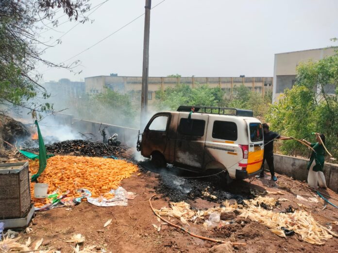 ( గుండ ప్రశాంత్ గౌడ్ )గొల్లపల్లి మండల కేంద్రంలో ఆదివారం రోజు 11 కె.వి విద్యుత్ వైరు తెగిపడి మంటలు చెలరేగడంతో భారీ ప్రమాదం చోటు చేసుకుంది. గొల్లపల్లి నుండి వెనుగుమట్ల వెళ్లే 11 కేవీ విద్యుత్ వైరు మండల కేంద్రంలోని అర్చనపెల్లి పద్మ ఇంటి దగ్గర తేగి కింద పడడం తో ఒక్కసారిగా మంటలు చెలరేగడం తో టాటా ఏస్ మరియు స్కూటీ తో పాటు ఇంటి ఆవరణలో అరబోసిన 25 క్వింటాల మొక్కజొన్న పూర్తిగా కాలి పోయాయి.దీంతో స్థానికులు అప్రమత్తమై విద్యుత్ సరఫరాను ఆపివేసి మంటలను సకాలంలో ఆర్పి వేయడంతో ఎలాంటి ప్రాణ నష్టం జరగలేదు. ఈ ఘటన లో తమకు సుమారు 8 లక్షల రూపాయల ఆస్తి నష్టం జరిగిందని ప్రభుత్వం ఆదుకోవాలని బాధితురాలు పద్మ తెలిపారు.