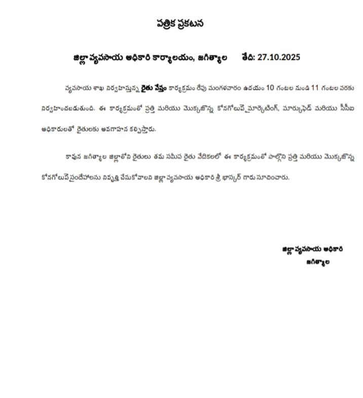 *జగిత్యాల జిల్లా లో రేపు రైతు నేస్తం కార్యక్రమం*—–జగిత్యాల –