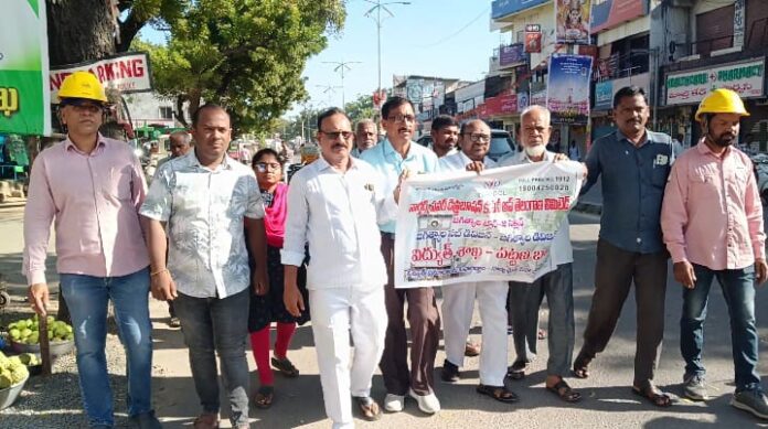 నేటి సాక్షి(పూరెళ్ల బాపు)………………………………….. విద్యుత్ శాఖ ఆధ్వర్యంలో విద్యుత్ వారోత్సవాల భాగంగా విద్యుత్ ప్రమాదాలపై అవగాహన *విద్యుత్ పట్టణ బాట* కార్యక్రమం నిర్వహించారు. విద్యుత్ పట్టణ బాట కార్యక్రమంలో భాగంగా స్థానిక తహసీల్ చౌరస్తా వద్ద విద్యుత్ వినియోదారులకు అవగాహన కల్పించారు. ఈ సందర్భంగా విద్యుత్ అధికారులు మాట్లాడుతూ ప్రతి ఒక్కరు కూడా ఇనుప వైర్లు పై బట్టలు గాని ఇతరత్రా ఆరబెట్టుకోకూడదని అలా చేయడంవల్ల విద్యుత్ ప్రమాదాలు జరిగే అవకాశం ఉందని అందుకాను ప్లాస్టిక్ తో కూడిన వైర్లను ఏర్పాటు చేసుకొని బట్టలు గాని ఆరబెట్టుకోవాలని కోరారు. విద్యుత్ ప్రమాదాలు గానీ ఇతరత్రా ప్రమాదంలో జరిగిన వెంటనే విద్యుత్ అధికారులకు, లైన్మెన్ లకు సమాచారం ఇవ్వాలని కోరారు. విద్యుత్ అధికారులు 24/7 అందుబాటులో ఉంటారని పేర్కొన్నారు.ఈ కార్యక్రమంలో ADE జవహర్ లాల్, నాయక్ రాంజీ, ఏఈ. సతీష్, అనూష, ప్రకాష్. ఉదయ్, శ్రీనివాస్, ప్రసాద్. మాజీ కౌన్సిలర్ ACS. రాజు, మాజీ అర్బన్ బ్యాంక్ వైస్ చైర్మన్ యం.డి. సెమియోద్దీన్, విద్యుత్ వినియోగదారులు తదితరులు పాల్గొన్నారు.