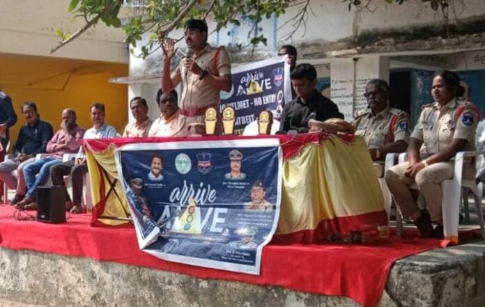 నేటి సాక్షి ప్రతినిధి ( సుధాకర్ గౌడ్) శంకర్ పల్లి; జనవరి 22.మోకిల పోలీసువారి ఆధ్వర్యంలో జనవాడ జిల్లా పరిషత్ ఉన్నత పాఠశాల లో గురువారం రోడ్డు భద్రతపై( ఆ రైవ్ ఆ లైవ్) భాగంగా రోడ్డు భద్రత పై అవగాన సదస్సులు, ఎస్సే రైటింగ్, డ్రాయింగ్ కాంపిటీషన్ విద్యార్థులతో నిర్వహించారు. ఈ సందర్భంగా విద్యార్థులను ఉద్దేశించి మోకిల ఇన్స్పెక్టర్ వీరబాబు మాట్లాడుతూ ప్రతి ఒక్కరూ ట్రాఫిక్ రూల్స్ పాటించాలని,హెల్మెంట్ ,సీటు ధరించాలని తెలిపారు. మద్యం సేవించి వాహనాలు నడపరాదని, రాంగ్ రూట్ ,త్రిబుల్ రైడింగ్ చేయరాదని అన్నారు అలాగే వాహనం నడిపేటప్పుడు డాక్యుమెంట్స్ కలిగి ఉండాలని తెలిపారు.ఏదైనా ఎమర్జెన్సీ ఉంటే 100-Dail కి కాల్ చేసి సమాచారం ఇస్తే తక్షణమే తాము స్పందిస్తామని తెలిపారు. విద్యార్థులు బాగా చదువు కొని వృద్ధులోకి రావాలని ఆకాంక్షించారు, పోటీల్లో విజేతలకు బహుమతులు అందజేశారు. ఈ కార్యక్రమంలో DI సమరం రెడ్డి, ఎస్ఐలు ధర్మ, రాథోడ్, పద్మ, మండల విద్యాధికారి అక్బర్ ఉపాధ్యాయులు, పోలీస్ సిబ్బంది , విద్యార్థులు పాల్గొన్నారు.