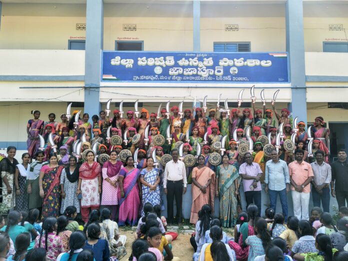 నేటి సాక్షి,నారాయణపేట, నవంబర్ 19వీరనారి లక్ష్మీబాయి జయంతి సందర్భంగా జాజాపూర్ ఉన్నత పాఠశాలలో 55 మంది బాలికలు వీరనారి వేషధారణ ధరించి మణికర్ణిక నృత్యాన్ని ప్రదర్శించారు. ఈ సందర్భంగా పాఠశాల ప్రధానోపాధ్యాయురాలు భారతి మాట్లాడుతూ దేశ స్వాతంత్రం కోసం వీరోచితంగా పోరాడి బ్రిటిష్ వారిని గడగడలాడించి అతి చిన్న వయసులో దేశం కోసం ప్రాణ త్యాగం చేసిన ఝాన్సీరాణి లక్ష్మీబాయి జీవితం అందరికీ ఆదర్శమని అన్నారు. పిల్లల్లో ధైర్య సాహసాలు నింపడం కోసమే ఝాన్సీ రాణి వేషధారణ కార్యక్రమాన్ని చేపట్టడం జరిగిందని తెలిపారు. బాల బాలికలు ఆమెను ఆదర్శంగా తీసుకొని క్రమశిక్షణతో, ధైర్యంతో ఎదగాలని సూచించారు ఈ కార్యక్రమంలో ఈ మధుసూదన్ భాను ప్రకాష్ మంగళ శ్రీదేవి పి శిరీష టీ నిర్మల శశిరేఖ ఏ ప్రతాప్ నర్సింలు రఘురామేశ్వర్ రెడ్డి మాణిక్యప్ప మరియు వెంకటేష్ పాల్గొన్నారు.