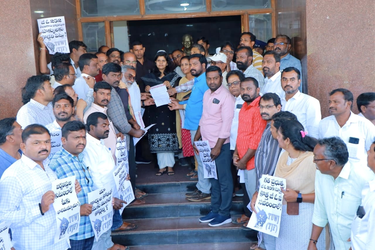 “నేటిసాక్షి, నల్లగొండ : తెలంగాణ రాష్ట్ర ప్రభుత్వం తాజాగా జారీచేసిన జీవో ఎంఎస్ నెంబర్ 252 ను వెంటనే రద్దు చేసి, జర్నలిస్టులకు న్యాయం చేయాలని తెలంగాణ యూనియన్ ఆఫ్ వర్కింగ్ జర్నలిస్ట్స్ టీయూడబ్ల్యూజే-H143 జిల్లా అధ్యక్షులు గుండగోని జయశంకర్ గౌడ్ ప్రభుత్వాన్ని డిమాండ్ చేశారు. ప్రభుత్వ ఉత్తర్వులు 252 జీవో సవరణ కోరుతూ, రాష్ట్ర కమిటీ పిలుపు మేరకు నల్లగొండ కమిటీ ఆధ్వర్యంలో శనివారం నల్లగొండ జిల్లా కలెక్టరేట్ కార్యాలయం ఎదుట జర్నలిస్ట్ లు భారీ నిరసన చేపట్టారు. అనంతరం జిల్లా కలెక్టర్ ఇలా త్రిపాఠి కి వినతి పత్రం అందజేశారు. ఈ సందర్భంగా ఆయన మాట్లాడుతూ, ప్రింట్, ఎలక్ట్రానిక్ మీడియా, డెస్క్ జర్నలిస్టుల హక్కులకు భంగం కలిగించే విధంగా తీసుకొచ్చిన జీఓ 252లోని నిబంధనలను వెంటనే సవరించాలని డిమాండ్ చేశారు. జీఓ 252లో స్పష్టతలేని నిబంధనలు, అక్రిడేషన్ భారీ కోతలు, మీడియా అక్రిడేషన్ కార్డు, మీడియా కార్డు పేరుతో గందరగోళం సృష్టించారని ఆరోపించారు. రిపోర్టర్లు, డెస్క్ జర్నలిస్టుల మధ్య విభేదాలు సృష్టించే ప్రయత్నాలను తీవ్రంగా వ్యతిరేకిస్తున్నామన్నారు. కేబుల్ ఛానెల్స్, పార్ట్టైం రిపోర్టర్లు, ఇండిపెండెంట్ జర్నలిస్టులకు జరుగుతున్న అన్యాయాన్ని ప్రభుత్వం వెంటనే గుర్తించి, అర్హులైన ప్రతి జర్నలిస్టుకు అక్రిడేషన్ అందేలా జీఓ.252ను పునఃసమీక్షించి సవరించాలన్నారు. ప్రభుత్వం ఇప్పటికైనా స్పందించకపోతే, జర్నలిస్టుల హక్కుల సాధన కోసం రాజ్యాంగం కల్పించిన హక్కుల ద్వారా దీర్ఘకాలిక ఆందోళన కార్యక్రమాలకు శ్రీకారం చేస్తామని హెచ్చరించారు. సమస్త జర్నలిస్టుల హక్కుల కోసం యూనియన్లకు అతీతంగా, ఐక్యంగా ఉద్యమిస్తామన్నారు. జర్నలిస్టులకు అన్యాయం చేస్తే ఊరుకోబోమని, హక్కుల సాధన కోసం ప్రాణ త్యాగానికైనా జర్నలిస్టులు సిద్ధంగా ఉన్నారన్నారు.జీఓ.252లో గజిబిజి నిబంధనలతో జర్నలిస్టుల హక్కులకు భంగం కలిగించే ప్రయత్నాలను మానుకో వాలన్నారు.‘మీడియా అక్రిడేషన్ కార్డు –మీడియా కార్డు’ పేరుతో గందరగోళం సృష్టిస్తున్నారని, ఏ కార్డు వల్ల ఏ ప్ర యోజనం అనే స్పష్టత లేదని విమర్శించారు. కొత్త నిబంధనలతో 10 వేలకుపైగా అక్రిడేషన్లు కోతపడే ప్రమాదం ఉందని, రిపోర్టర్లు–డెస్క్ జర్నలిస్టుల మధ్య విభేదాలు సృష్టించే ప్రయత్నాలు మానుకోవాలని సూచించారు. కేబుల్ ఛానెల్స్, పా ర్ట్టైం రిపోర్టర్లకు తీవ్ర అన్యాయం జరగనుందని, ఇండిపెండెంట్ జర్నలిస్టుల అనుభవం 10 నుంచి 15 ఏళ్లకు పెంపుపై అభ్యంతరం వ్యక్తం చేశారు. మెజారిటీ జర్నలిస్టులు వ్యతి రేకిస్తున్న జీఓ 252ను వెంటనే సవరించాలని, ప్రభుత్వం స్పందించకపోతే దీర్ఘకాలిక ఆందోళనలకు వేనకాడేది లేదని హెచ్చరించారు. ఈ కార్యక్రమంలో యూనియన్ జిల్లా ప్రధాన కార్యదర్శులు వీరస