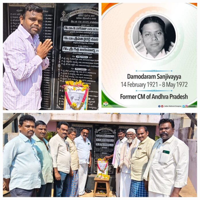 నేటి సాక్షి 14 ఫిబ్రవరి జూపాడుబంగ్లా:- మండల కేంద్రమైన జూపాడుబంగ్లాలో ఉమ్మడి ఆంధ్రప్రదేశ్ రాష్ట్రానికి దళిత తొలి ముఖ్యమంత్రిగా పనిచేసిన దామోదరం సంజీవయ్య105వ జయంతిని పురస్కరించుకొని ఫ్రెండ్స్ యూత్ అసోసియేషన్ అధ్యక్షుడు గోపాల్ ఆధ్వర్యంలో ప్రజాసంఘాల నాయకులతో కలిసి సంజీవయ్య చిత్రపటానికి పూలమాలలు వేసి, ఘనంగా నివాళులర్పించారు. ఈ సందర్భంగా ఫ్రెండ్స్ యూత్ అసోసియేషన్ అధ్యక్షుడు గోపాల్, మాల మహానాడు అధ్యక్షుడు ఆర్ఎంపీ డాక్టర్ ఎర్రన్న, తదితర ప్రజాసంఘాల నాయకులు మాట్లాడుతూ దేశంలో దళిత తొలి ముఖ్యమంత్రిగా ఆంధ్ర రాష్ట్రానికి ఎనలేని సేవలు అందించాలని వారు కొనియాడారు ఎన్నో రాజకీయ పదవులు చేపట్టి అనుభవించినప్పటికీ నిస్వార్ధంగా నిజాయితీగా నిరాడంబరంగా జీవించారన్నారు అంతే కాకుండా ఏఐసీసీ జాతీయ ఉపాధ్యక్షుడిగా కేంద్ర మంత్రిగా పనిచేశారని గుర్తు చేశారు ఆయన చేసిన సేవలకు కర్నూలు జిల్లాలోని పెద్దపాడులొ విగ్రహాలు ఏర్పాటు చేయడం జరిగిందన్నారు. ఈ కార్యక్రమంలో మాజీ సర్పంచ్ సుధాకర్, నక్క మల్లయ్య, బాల నారాయణ గౌడ్, షాలు భాష, మన్సూర్ భాష, వెంకటస్వామి, బాదుల్లా, బ్యాంకు గిరి, తదితరులు పాల్గొన్నారు.