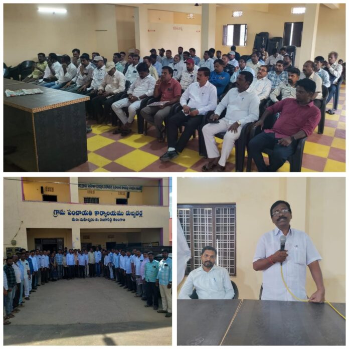 గ్రామపంచాయతీ సిబ్బందికి శాశ్వత ఉద్యోగ భద్రత డిమాండ్ నేటి సాక్షి ప్రతినిధి,మహేశ్వరం(చిక్కిరి. శ్రీకాంత్) గ్రామపంచాయతీ ఉద్యోగ సంఘాల హడ్ హక్ కమిటీ ఏర్పాటు.పాల్గొన్న రాష్ట్ర,జిల్లా నేతలు రంగారెడ్డి జిల్లా మహేశ్వరం మండలం దుబ్బచర్ల గ్రామపంచాయతీలో ఆదివారం గ్రామపంచాయతీ ఉద్యోగుల సంఘం రాష్ట్ర కమిటీ సమావేశం ఏర్పాటు జరిగింది. సమావేశంలో మూడు సంఘాల రాష్ట్ర అధ్యక్షుల అనుమతితో రాష్ట్ర జేఏసీ అడ్ హక్ కమిటీ కన్వీనర్లను ఎన్నుకున్నారు. సమావేశంలో మూడు సంఘాల రాష్ట్ర అధ్యక్షులు మామిడాల నరసింహులు,సాదుల శ్రీకాంత్,బింగి గణేష్ ల ఆధ్వర్యంలో పంచాయతీ ఉద్యోగుల సమస్యల పరిష్కారానికి గాను ప్రభుత్వంపై వత్తిడి తెచ్చేందుకు గాను ఐక్య కార్యాచరణ రూపొందించేందుకు ప్రకటించారు.త్వరలో ఈ మేరకు అన్ని సంఘాల బాధ్యులతో మరో సమావేశం ఏర్పాటు చేయనట్లు వారు ప్రకటించారు.ఈ సందర్భంగా మాట్లాడుతూ కరోవర్ బిల్ కలెక్టర్లను జీవో 51 నుంచి మినహాయింపు చేయాలని,పంచాయతీ సిబ్బంది అందరికీ ఉద్యోగ భద్రత కల్పించి పెర్మనెంట్ చేయాలని,కారోబార్,బిల్ కలెక్టర్లను పంచాయతీ అసిస్టెంట్లుగా నియమించాలని,గ్రామపంచాయతీలో పనిచేస్తున్న అన్ని కేటగిరీల సిబ్బందికి కనీస అమలు చేయాలని డిమాండ్ చేశారు.రాష్ట్ర జేఏసీ అడ్హక్ కన్వీనర్లుగా పిళ్లి రవి,మేకల శ్రీధర్,కంజర్ల భాస్కర్,జంగయ్య, వంగ రవీందర్,మురళి,కొండ గొర్ల శీను,అంకం సదానందం,రత్నాపురం పద్మారావు,చిలుక మారుతి.సిహెచ్ మల్లా చారి లను ఎన్నుకున్నారు.హడ్ హాక్ కన్వీనర్లతో తో పాటు అన్ని సంఘాల రాష్ట్ర అధ్యక్షులతో హైదరాబాదులో త్వరలో మరో సమావేశం ఏర్పాటు చేయనున్నట్లు వారు వెల్లడించారు.కార్యక్రమంలో రాష్ట్ర నాయకులు,జిల్లా ముఖ్య నాయకులు జొన్నకోటి వెంకటేష్,బాలరాజు,శ్రీనివాస్,దయాకర్ రెడ్డి,ములుగు సురేందర్,రాగల లక్ష్మణ్,పరశురాములు రాజు,విజయ్,సంతోష్ కుమార్,కృష్ణ,కనుకయ్య,రమేష్,తిరుపతి,మహేందర్,శేఖర్ కొమురవెల్లి ప్రదీప్ సతీష్,ప్రభాకర్,గొల్లపల్లి బాబు,ఇప్ప వెంకటేష్,బాలరాజు,ఆంజనేయులు,రాజ్ మీరు, రాజేందర్,అశోక్,తదితరులు పాల్గొన్నారు.