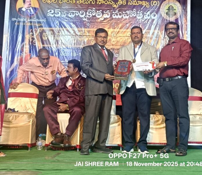 నేటి సాక్షి – మేడిపల్లి*( రాధారపు నర్సయ్య )18 ఏళ్లుగా సేవా కార్యక్రమాల్లో నిలకడగా ముందంజలో ఉన్న జైర్డ్స్ (JIRDS) స్వచ్ఛంద సేవా సంస్థ చైర్మన్ అంగడి ఆనంద్కుమార్కు ప్రతిష్టాత్మక ‘తెలంగాణ రత్న సేవా పురస్కార్–2025’ లభించింది. తెలుగు సాంస్కృతిక మహోత్సవాల సందర్భంగా విజయవాడలో ఏర్పాటు చేసిన ప్రత్యేక సమావేశంలో ఈ అవార్డును ప్రదానం చేశారు.*మెట్రోపాలిటన్ స్పెషల్ మేజిస్ట్రేట్ చేతుల మీదుగా పురస్కారం*విజయవాడ వెలదండుల హనుమంతరావు గ్రంథాలయంలో జరిగిన కార్యక్రమంలో మెట్రోపాలిటన్ స్పెషల్ మేజిస్ట్రేట్ దేవ్ నరసింహరావు స్వయంగా ఆనంద్కుమార్ను సత్కరించారు. ఈ కార్యక్రమంలో సర్వే & ల్యాండ్ రికార్డ్స్ ఆర్జెడి CH.V.S.N. కుమార్, తెలంగాణ యూనివర్సిటీ కూచిపూడి మాజీ ప్రిన్సిపాల్ వేదాంత రామలింగ శాస్త్రి, సంస్థ సభ్యులు, గడగండ్ల విజయ్కుమార్ పాల్గొన్నారు.*సేవా కార్యక్రమాలకు గుర్తింపుగా అవార్డు*భీమారం మండలం, వెంకట్రావుపేట గ్రామానికి చెందిన అంగడి ఆనంద్కుమార్, జైర్డ్స్ సంస్థ ద్వారా గత 18 సంవత్సరాలుగా ఆరోగ్య శిబిరాలు, విద్యా సహాయం, పేదలకు మద్దతు, విపత్తుల సహాయ కార్యక్రమాలు వంటి పలు సేవా కార్యక్రమాలు నిర్వహిస్తున్నారు. ఈ నిరంతర సేవాభావం, సామాజిక రంగంలో చూపిన అంకిత భావానికి గుర్తింపుగా అఖిల భారత తెలుగు సాంస్కృతిక సమైక్య మరియు తెలుగు సాంస్కృతిక మహోత్సవం సంయుక్తంగా ఈ పురస్కారాన్ని ప్రదానం చేసినట్లు నిర్వాహకులు తెలిపారు.______