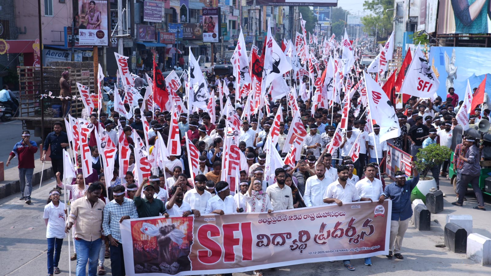 నేటి సాక్షి తిరుపతి (బాదూరు బాల) నిత్యం గోవింద నామాలు వినిపించే తిరునగరం తిరుపతిలో శుక్రవారం విద్యార్థుల స్ఫూర్తి నినాదాలతో మారు మ్రోగింది. ఎస్ఎఫ్ఐ రాష్ట్ర మహాసభలు సందర్భంగా కేంద్ర, రాష్ట్ర, నాయకత్వ ఆధ్వర్యంలో విద్యార్థులు భారీ స్థాయిలో ర్యాలీ నిర్వహించారు. భారత విద్యార్థి సమైక్య ( ఎస్ఎఫ్ఐ) 25వ రాష్ట్ర మహాసభలను 12, 13,14 తేదీలలో మూడు రోజులు పాటు తిరుపతిలో నిర్వహిస్తున్నారు. రాష్ట్ర మహాసభలు ప్రారంభం సందర్భంగా మొదటి రోజు తిరుపతి నగరంలో విద్యార్థులు భారీ ప్రదర్శన నిర్వహించారు. విద్యా కేంద్రంగా ఎదుగుతున్న తిరుపతిలో విద్యార్థులు ఉదయం 8 గంటలకే శ్రీ వెంకటేశ్వర ఆర్ట్స్ కళాశాల ముంగిటకు చేరుకున్నారు. ఈ సందర్భంగా విద్యార్థుల ఉద్యమ స్ఫూర్తి గీతాలను ఆలపిస్తూ యువతను ఉత్తేజపరిచారు. సరిగ్గా 11 గంటలకు ఐన్ స్టీన్ విగ్రహం నుంచి వేలాదిమంది విద్యార్థులతో ఎస్ఎఫ్ఐ కేంద్ర నాయకత్వం ముందు నడవగా విద్యార్థుల భారీ ప్రదర్శన ప్రారంభమైంది. క్రమశిక్షణకు మారుపేరైన ఎస్ఎఫ్ఐ వాలంటరీల భద్రత నడుమ, ఎస్ఎఫ్ఐ జిల్లా నాయకత్వ పర్యవేక్షణలో ప్రారంభమైన ఈ ర్యాలీ కదిలింది. కామ్రేడ్ కొట్టవిట్టం పెంచులయ్య విప్లవ జ్యోతి వాహనం ముందు కదలగా దాని వెనకే జాతీయ నాయకుల్లో స్ఫూర్తి దాతలు చిత్రపటాలతో బాలికలు అనుసరించగా, ఎస్ఎఫ్ఐ వాలంటరీలు వెంటరాగా, డప్పుల దరువులతో, సాంస్కృత కళారూపాలతో, దేశాన్ని, యువత జీవితాన్ని ఛిద్రం చేస్తున్న కాషాయి పార్టీ ఆగడాలను తలపించే వేషధారణలతో, ఎస్ఎఫ్ఐ కేంద్ర నాయకత్వం ముందు నడవగా వారు వెనువెంటే రాష్ట్ర నాయకత్వం విద్యార్థి లోకం కదిలింది. విద్యార్థి కెరటాలతో మహాసముద్రాన్ని తలపించేలా ఈ భారీ ప్రదర్శన 3 కిలోమీటర్లు దూరం సుమారు రెండు గంటల పాటు సాగింది. బాలాజీ కాలనీలోని మహాత్మ జ్యోతిరావు పూలే విగ్రహానికి పూలమాలు వేసిన తరువాత టౌన్ క్లబ్ సర్కిల్, మహతి ఆడిటోరియం, తిరుపతి క్రైమ్ పోలీస్ స్టేషన్, పాత జ్యోతి థియేటర్, రామకృష్ణ ఢీలాక్స్ సర్కిల్, స్విమ్స్ ఎదుట ఉన్న వాల్మీకి సర్కిల్ మీదగా తిరుపతి కార్పొరేషన్ కార్యాలయం ఎదురుగా ఉన్న నెహ్రూ మున్సిపల్ హై స్కూల్ మైదానం వరకు విద్యార్థుల ర్యాలీ ఉద్యమ స్ఫూర్తిని రగిలించే నినాదాలతో సాగింది. పిల్లలనుంచి వృద్ధుల వరకు రెట్టించిన ఉత్సాహాన్ని నింపింది ఈ మహా ర్యాలీ. అనంతరం ఎస్ఎఫ్ఐ రాష్ట్ర 25వ మహాసభల సందర్భంగా మొదటి రోజు ఏర్పాటు చేసిన బహిరంగ సభ ప్రారంభమైంది. ఈ కార్యక్రమంలో ఎస్ఎఫ్ఐ జాతీయ అధ్యక్షులు ఆదర్శ యం సాజీ, ప్రధాన కార్యదర్శి శ్రీజన్ భట్టాచార్య, రాష్ట్ర అధ్యక్షుడు రామ్మోహన్ రావు, ప్రధాన కార్యదర్శి ప్రసన్నకుమార్, జిల్లా అధ్యక్ష కార్యదర్శులు అక్బర్ భగత్ రవి, ఎస్ఎఫ్ఐ రాష్ట్ర జిల్లా పూర్వ నాయకులు, ఎస్