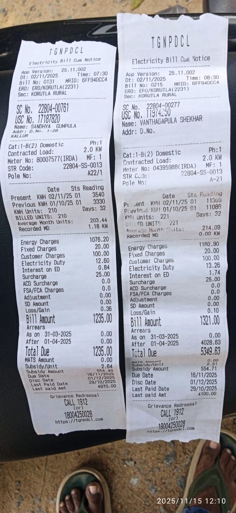 *నేటి సాక్షి – కోరుట్ల*( రాధారపు నర్సయ్య )తెలంగాణలో ‘గృహజ్యోతి’ పథకం కింద సాగుతోన్న ‘బిల్లింగ్ దందా’..కోరుట్ల మండలం కల్లూరు గ్రామంలో వెలుగులోకి వచ్చింది.! ‘గృహజ్యోతి’ పథకం పేరుతో సాగుతున్న ‘బిల్లింగ్ బండారం’ రాష్ట్రవ్యాప్త చర్చనీయాంశంగా మారింది. 200 యూనిట్ల వరకు ఉచిత విద్యుత్ అని ప్రకటించిన ప్రభుత్వం… 32 రోజులకోసారి బిల్లు కొట్టి, అర్హులైన బిపిఎల్ కుటుంబాల నుంచి నెలకు రూ.200-500 వసూలు చేస్తూ డిస్కామ్లు ‘స్లాబ్ ట్రిక్’తో ఆదాయం పెంచుకుంటున్నాయి. ఇది కేవలం డేటా లోపమా.? లేక ప్రభుత్వ సైలెంట్ ఆమోదంతో జరుగుతున్న దోపిడీనా? అన్నదానిపై ‘నేటిసాక్షి’ అందిస్తోన్న పూర్తి రిపోర్ట్.!*’గృహజ్యోతి’ పథకం ఉద్దేశ్యం.!*తెలంగాణ కాంగ్రెస్ 2023 ఎన్నికల మేనిఫెస్టోలో ‘గృహ జ్యోతి’ పేరుతో ప్రకటించిన ఉచిత విద్యుత్ పథకం 2024 మార్చి 1 నుంచి అమలులోకి వచ్చింది. వైట్ రేషన్ కార్డు ఉన్న ప్రతి కుటుంబానికి నెలకు 200 యూనిట్ల వరకు జీరో బిల్ ఇస్తామని ప్రభుత్వం హామీ ఇచ్చింది. ఇప్పటివరకు తెలంగాణ వ్యాప్తంగా 5.11 కోట్ల కుటుంబాలకు జీరో బిల్లులు జారీ అయినట్టు అధికారులు చెబుతున్నారు. కానీ..గ్రామాలు..పట్టణాలు.. మున్సిపల్ పరిధిలోని పేదలకు ఈ హామీ కేవలం కాగితంపైనే ఉంది. ఆధార్-కస్టమర్ ఐడి లింక్ లేకపోవడం, ప్రజా పాలన అప్లికేషన్లలో డేటా ఎంట్రీ తప్పులు..ఇవన్నీ సామాన్యుల జేబును ఖాళీ చేస్తున్నాయి.!*32 రోజుల బిల్లింగ్ ట్రిక్-సాంకేతికత కాదు, ఆర్థిక దందా*సాధారణంగా విద్యుత్ బిల్లింగ్ 30 రోజుల సైకిల్లో జరగాలి. కానీ.. మీటర్ రీడర్లు 29 నుంచి 32 రోజులకోసారి..ఆ తర్వాత రీడింగ్ తీస్తున్నారు. ఫలితం.? 0-50 యూనిట్ల స్లాబ్లో ఉండాల్సిన వినియోగం 51-100 స్లాబ్కు చేరి, రూ.2.60 నుంచి రూ.4.30 వరకు యూనిట్ ఛార్జ్ పడుతోంది. ఒక్కో ఇంటికి నెలకు రూ.200-500 అదనం భారం పడుతోంది. టిఎస్ఎస్పిడిసిఎల్ అధికారులు ‘సైకిల్ డిలే సహజం’ అని సాకులు చెబుతున్నా, బిఆర్ఎస్ నాయకులు ‘ఇది ప్రభుత్వం రోల్బ్యాక్ పాలసీ’ అని ఆరోపిస్తున్నారు.*తప్పు ఎవరిది.? మీటర్ రీడర్ నుంచి ప్రభుత్వ పెద్దలవరకు బాధ్యతల గందరగోళం*మీటర్ రీడర్ కేవలం వినియోగం రికార్డ్ చేస్తాడు. బిల్ జనరేషన్ డిస్కామ్ సర్వర్లో జరుగుతుంది. ‘గృహ జ్యోతి’ అర్హత ఆధార్ లింక్, రేషన్ కార్డు వెరిఫికేషన్పై ఆధారపడి ఉంటుంది. ప్రజా పాలన పోర్టల్లో 2.5 లక్షల అప్లికేషన్లు ఇంకా పెండింగ్లో ఉన్నాయి. ఎన్నికల మోడల్ కోడ్, సిబ్బంది కొరత..ఇవన్నీ ఆలస్యానికి కారణాలుగా చెబుతున్నారు. కానీ ఫీల్డ్ లెవల్లో ఎఇలు, డిఇలు ‘పైనుంచి ఆర్డర్ లేదు’ అని చేతులు ఎత్తేస్తున్నారు. ప్రభుత్వం సబ్సిడీ చెల్లిస్తోంది కానీ అమలు డిస్కామ్ల చేతుల్లోనే ఉంది.*లాభ-నష్ట లెక్క-డిస్కామ్ ఖజానాకు రూ.కోట్లు.. ప్రజలకు రూ.లక్షల భారం* అర్హులు జీరో బిల్ పొంద