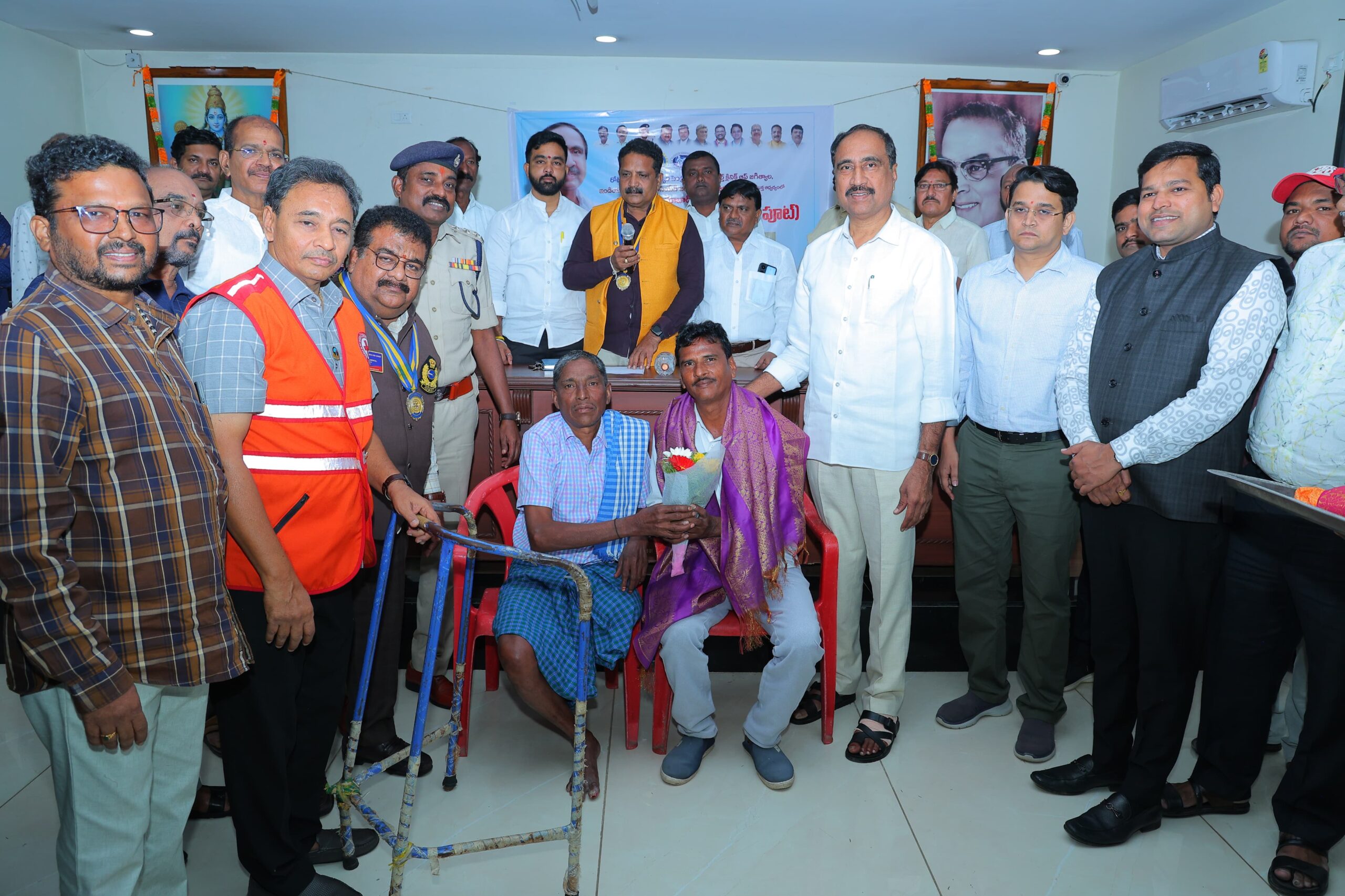 నేటి సాక్షి(పూరెళ్ల బాపు)…………………………………జగిత్యాల ఐ ఎం ఏ భవన్ లోఆపి,రోటరీ క్లబ్ జగిత్యాల ఇండియన్ మెడికల్ అసోసియేషన్ జగిత్యాల,జగిత్యాల క్లబ్ సంయుక్త ఆధ్వర్యంలో రోటరీ క్లబ్ నిజామాబాద్ వారి సహకారం తో కాలు లేని దివ్యాంగులకు ఉచిత కృత్రిమ కాలు (జైపూర్ ఫుట్) కొలతలు శిబిరంలో పాల్గొన్న జగిత్యాల ఎమ్మెల్యే డా సంజయ్ కుమార్.ఈ కార్యక్రమంలో DSP రఘు చందర్, నిజామాబాద్ జగిత్యాల రోటరీ క్లబ్ సభ్యులు శ్యామ్,అగర్వాల్,మంచాల కృష్ణ,చారి,కొత్త ప్రతాప్,రాజు,ima అధ్యక్షులు డా.హేమంత్,కార్యదర్శి డా.శ్రీనివాస్,కోశాధికారి డా.సుధీర్,మాజీ మున్సిపల్ చైర్మన్ గిరి నాగభూషణం,మాజీ వైస్ చైర్మన్ గోలి శ్రీనివాస్,జగిత్యాల క్లబ్ అధ్యక్షులు ముస్కు రామ్ గోపాల్ రెడ్డి,ci కరుణకర్, మాజీ కౌన్సిలర్ కుసరి అనిల్,నాయకులు ఎల్జీ రమేష్,ఫరూక్,మహేష్,ఆపి రోటరీ క్లబ్ సభ్యులు దివ్యాంగులు నాయకులు తదితరులు పాల్గొన్నారు.