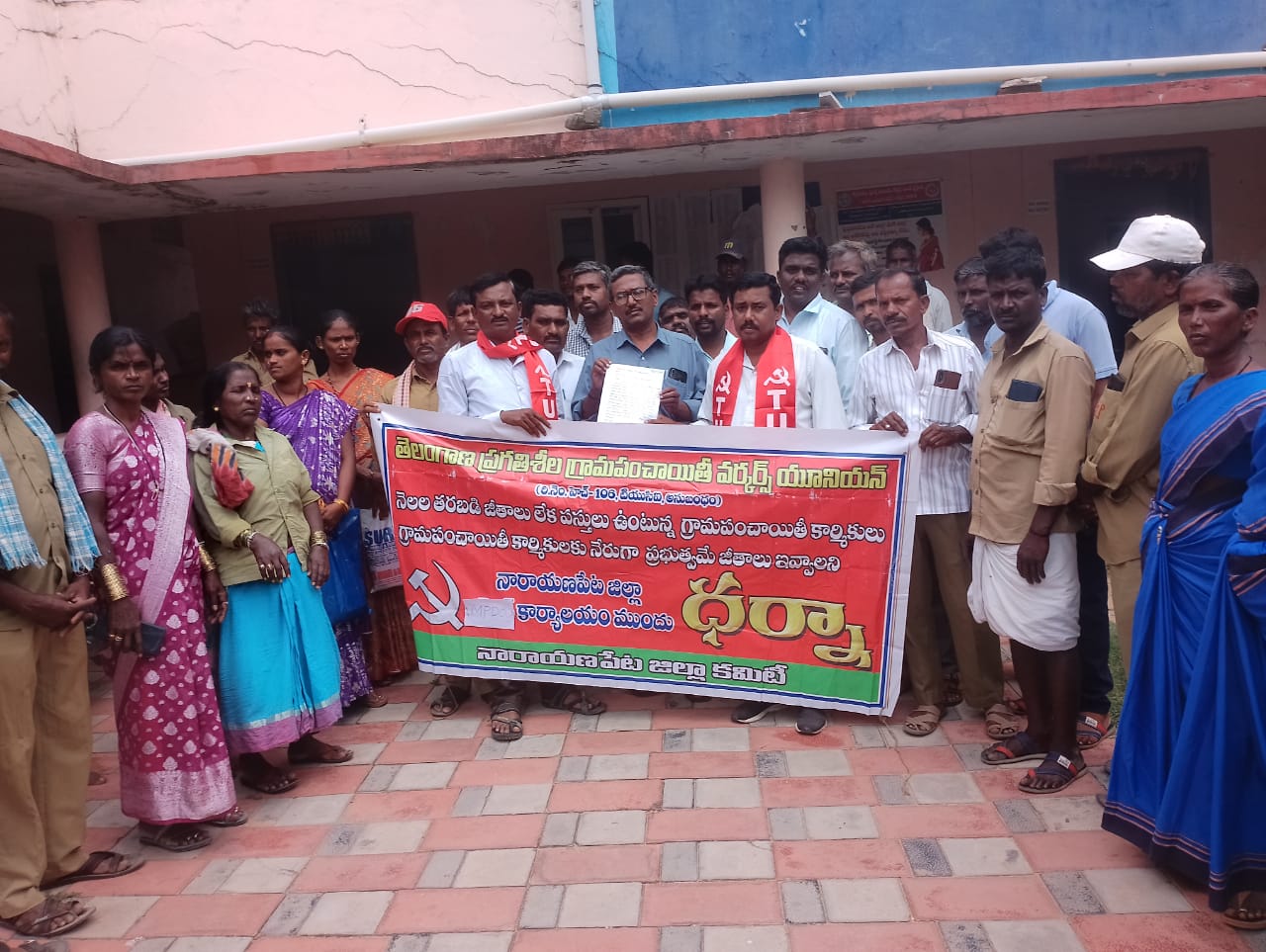 గ్రామపంచాయతీ కార్మికుల నాలుగు నెలల పెండింగ్ జీతాలు వెంటనే ఇవ్వాలి నారాయణపేట ఎంపీడీవో ఆఫీస్ ముందు ధర్నా నేటి సాక్షి, నారాయణపేట, జూన్ 23,గ్రామపంచాయతీ కార్మికుల నాలుగు నెలల పెండింగ్ జీతాలు వెంటనే ఇవ్వాలని నారాయణపేట ఎంపీడీవో ఆఫీస్ ముందు ధర్నా నిర్వహించారు. ఈ ధర్నాకు అధ్యక్షత ఎదురింటి నరసింహులు వహించగా ఈ ఈ కార్యక్రమానికి ఉద్దేశించి( టి యు సి ఐ ) జిల్లా ఉపాధ్యక్షులు బి.నర్సిములు తెలంగాణ ప్రగతిశీల గ్రామపంచాయతీ వర్కర్స్ యూనియన్ జిల్లా అధ్యక్షుడు ఏ నరసింహ మాట్లాడుతూ పంచాయతీ కార్మికులు చెత్త, చెదారం మధ్య పని చేస్తూ తమ ఆరోగ్యాలను పణంగా పెట్టి పల్లెలను శుభ్రంగా ఉంచుతూ ప్రజల ఆరోగ్యాలను కాపాడుతుంటే వారి సమస్యలను పరిష్కరించవలసిన ప్రభుత్వాలు నిర్లక్ష్యంగా వ్యవహరిస్తున్నాయని విమర్శించారు. వారికి శ్రమకు తగ్గ ఫలితం ఇవ్వకుండా వారి శ్రమను కారు చౌకగా దోచుకుంటున్నారని విమర్శించారు. మున్సిపాలిటీలో, గ్రామపంచాయతీలో పనిచేసే కార్మికులు ఓకే పని చేస్తున్నప్పటికీ మున్సిపాలిటీలో జీవో నెంబర్ 60 ప్రకారం16,500 చెల్లిస్తుంటే గ్రామపంచాయతీ కార్మికులకు మాత్రం 9500 మాత్రమే చెల్లిస్తున్నారన్నారు. ఈ వేతనాలు కూడా ప్రతి నెల చెల్లించకుండా నెలల తరబడి పెండింగ్ పెడుతున్నారు అన్నారు. దీనివల్ల కుటుంబ పోషణ భారమై కార్మికులు ఆర్థికంగా ఇబ్బంది పడుతున్నారు అన్నారు. మల్టీపర్పస్ విధానం పేరుతో అనుభవం లేని పనులు చేయించడం వలన అనేక మంది మృత్యువాత పడుతున్నారని ఆవేదన వ్యక్తం చేశారు. వీరికి ఎలాంటి చట్టబద్ధ హక్కులు, సౌకర్యాలు కల్పించడం లేదన్నారు. గ్రామపంచాయతీ కార్మికులకు జీవో నెంబర్ 60 ప్రకారం వేతనాలు చెల్లించాలని, గ్రామపంచాయతీ కార్మికులకు ప్రతినెల జీతాలు చెల్లించుటకు ప్రభుత్వం ప్రత్యేక బడ్జెట్ ను కేటాయించాలని, మల్టీపర్పస్ వర్కర్స్ విధానాన్ని రద్దు చేయాలని, ఉద్యోగ భద్రత కల్పించాలని, పిఎఫ్, ఈఎస్ఐ, ఇన్సూరెన్స్ సౌకర్యాలు కల్పించాలని, పదవీ విరమణ బెనిఫిట్ కింద 5 లక్షలు చెల్లించాలని, కార్మికులు మరణించినా, పదవీ విరమణ పొందినా వారి కుటుంబంలో ఒకరికి ఉద్యోగ అవకాశం కల్పించాలని తదితర డిమాండ్లను పరిష్కరించాలని డిమాండ్ చేస్తూ, గ్రామపంచాయతీ పర్మిట్ చేయాలని డిమాండ్ చేశారు ఈ కార్యక్రమంలో జిల్లా నాయకులు మండల అధ్యక్ష కార్యదర్శులు వెంకటయ్య, రాజు, కృష్ణయ్య , రామ్ చందర్, వెంకటేష్ బాలకృష్ణ, రాములు నారాయణ, కాళప్ప, సిద్ధిరాం, మహేష్ గోపాల్, అశోక్, భీమ్సప్ప, ఓడెప్ప, లక్ష్మి, పద్మమ్మ, నరసింహులు, గోవింద్, వెంకటప్ప, ఆంజనేయులు,తదితరులు పాల్గొన్నారు.