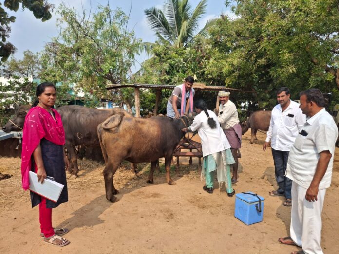 నేటి సాక్షి, మునగాల ( పాముల రాఘవేందర్) మునగాల మండలం రేపాల గ్రామంలో పశువుల ఆరోగ్య పరిరక్షణ కోసం పశువైద్య శాఖ ఆధ్వర్యంలో మంగళవారం ఉచితంగా గాలికుంట వ్యాధి నివారణ టీకాల కార్యక్రమం నిర్వహించారు. గ్రామంలోని పశువులకు వ్యాధులు రాకుండా ఉండేందుకు ప్రత్యేకంగా టీకాలు వేయడంతో పాటు పశుపాలకులకు పశువుల సంరక్షణపై అవగాహన కల్పించారు.ఈ కార్యక్రమాన్ని పశువైద్య అధికారి డాక్టర్ బి. మమత తమ సిబ్బందితో కలిసి నిర్వహించారు. రైతులు తమ పశువులను ఆరోగ్యంగా ఉంచుకోవడానికి ప్రభుత్వం అందిస్తున్న ఈ ఉచిత సేవలను తప్పకుండా వినియోగించుకోవాలని ఆమె సూచించారు. అలాగే రేపాల గ్రామంలో ( మార్చి 10 నుండి16వ తేదీల వరకు ) సీతనాగారం( 17నుండి 20వ తేదీల వరకు ) జగన్నాధపురం ( 23 నుండి 28వ తేదీ వరకు ) నరసింహుల గూడెం ( 30 నుంచి ఏప్రిల్ 04వ తేదీ వరకు) విజయ రాఘవాపురం( ఏప్రిల్ 06 నుండి09వ తారీకు వరకు) శిబిరాలు నిర్వహిస్తామని తెలిపారు. ఈ కార్యక్రమానికి రేపాల గ్రామ సర్పంచ్ మొగిలిచర్ల సత్యనారాయణ పాల్గొని ఆయన మాట్లాడుతూ. రైతుల అభివృద్ధిలో పశుసంవర్ధక రంగం కీలక పాత్ర పోషిస్తుందని, పశువుల ఆరోగ్య సంరక్షణ కోసం ఇలాంటి కార్యక్రమాలు గ్రామాల్లో కొనసాగడం ఆనందకరమని తెలిపారు.ఈ కార్యక్రమంలో పశువైద్య సిబ్బంది, ఎల్ ఎస్ ఏ ప్రమీల,గోపాలమిత్ర శీను గ్రామ ప్రజలు పశుపాలకులు పెద్ద సంఖ్యలో పాల్గొన్నారు.