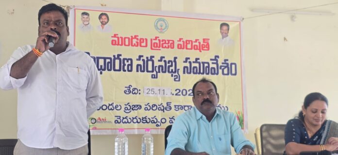 నేటి సాక్షి తిరుపతి (బాదూరు బాల)వెదురుకుప్పం;-మండలంలోని ప్రజా ప్రతినిధులు అధికారులను సమన్వయం చేసుకొని అభివృద్ధి పనులు చేసుకోవాలని చవట గుంట సింగల్ విండో చైర్మన్ సుధాకర్ రెడ్డి స్పష్టం చేశారు. మంగళవారం వెదురుకుప్పం ఎంపీడీవో కార్యాలయంలో జరిగిన మండల సాధారణ సర్వసభ్య సమావేశంలో ఆయన ముఖ్య అతిథిగా హాజరైనారు. నాయకులను ప్రజా ప్రతినిధులను ఉద్దేశించి ప్రసంగించారు. మండలంలోని అన్ని పంచాయతీలలో ఉన్న గ్రామాలు అన్ని విధాలుగా అభివృద్ధి చెందాలంటే ప్రజా ప్రతినిధులు అధికారులు కలిసిమెలిసి ముందుకు నడవాలని సూచించారు. స్థానిక శాసనసభ సభ్యులు డాక్టర్ వి ఎం థామస్ నేతృత్వంలో వెదురు కుప్పం మండలాన్ని అన్ని విధాలుగా అభివృద్ధి చేసుకునేందుకు ప్రతి ఒక్కరు ముందుకు రావాలని హితవు పలికారు
