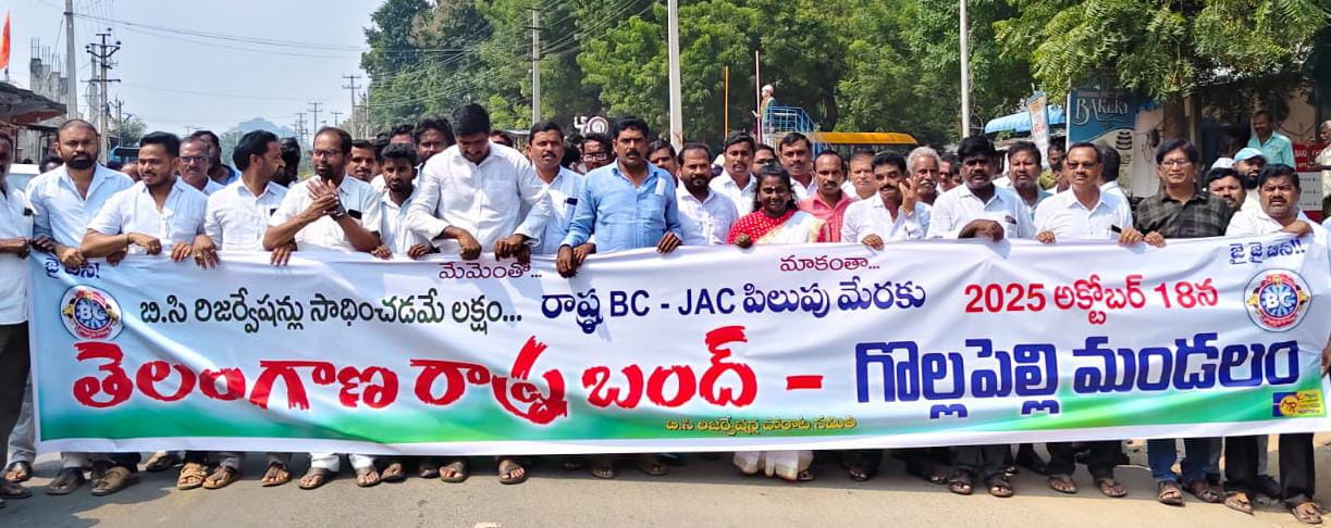 నేటి సాక్షి, జగిత్యాల ప్రతినిధి:* ( గుండ ప్రశాంత్ గౌడ్ )స్థానిక సంస్థల ఎన్నికలలో విద్య మరియు ఉద్యోగాలలో బీసీలకు 42% రిజర్వేషన్ రాష్ట్ర ప్రభుత్వం కల్పిస్తుంటే అడ్డుకున్నటువంటి అగ్రవర్ణాలకు మరియు న్యాయ వ్యవస్థ కూడా బీసీల పట్ల వ్యతిరేక తీర్పులను ప్రదర్శిస్తున్నందుకు నిరసనగా శనివారం బీసీ సంఘాల ఇచ్చిన పిలుపుమేరకు, తెలంగాణ రాష్ట్ర బీసీ బంద్ లో భాగంగా గొల్లపల్లి మండల కేంద్రంలో భారీగా తరలివచ్చి తెల్లవారుజాము నుండి విద్యాసంస్థలను, వ్యాపార వాణిజ్య సముదాయాల షాపులను, హోటలను, ప్రభుత్వ కార్యాలయాలైన బ్యాంకులు, తహశీల్దార్ కార్యాలయం ప్రశాంతంగా బంద్ చేయించి,గొల్లపల్లి మండల కేంద్రంలోని సుమారు నాలుగు గంటలు రాస్తారోకో నిర్వహించారు.ఈ సందర్భంగా వారు మాట్లాడుతూ, బీసీ బిల్లును తప్పనిసరిగ్గా గవర్నర్, కేంద్ర ప్రభుత్వం వెంటనే ఆమోదించాలని, కాంగ్రెస్ ప్రభుత్వం ఎన్నికల్లో ఇచ్చిన మాటను నిలబెట్టుకోవాలని కోరారు. ఈ బంద్ కార్యక్రమంలో బీసీ సంఘాలు ప్రజాసంఘాల నేతలు అన్ని సంఘలు అన్ని రాజకీయ నాయకులు పాల్గొన్నారు