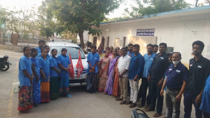 *నేటి సాక్షి సిరిసిల శివకుమార్* సిరిసిల్ల జిల్లాలోని ప్రభుత్వ ఆసుపత్రిలో పనిచేసే సానిటేషన్ సెక్యూరిటీ గార్డ్స్ ప్రభుత్వం వెంటనే కనీస వేతనం 26,000 అందించాలని హైదరాబాదులో జరుగుతున్న ధర్నా కార్యక్రమంలో పాల్గొనడానికి వెళ్లడం జరిగింది ఈ సందర్భంగా ప్రభుత్వ ఆసుపత్రిలో పనిచేసే నాయకులు శ్రీరామ్ సదానందం గారు మాట్లాడుతూ ప్రభుత్వ ఆసుపత్రిలో పనిచేసేటువంటి సానిటేషన్ కార్మికులు రోగులకు తన ప్రాణాలు ప్రాణంగా పెట్టి సేవలందిస్తున్నారు ప్రభుత్వం వారి సేవలను గుర్తించడం లేదు 11వేల వేతనం తోటి కుటుంబాలు గడవక తీవ్ర ఇబ్బందులకు గురవుతున్నారు ఆస్పత్రిలో 200 కొడుకులకు సరిపోయే కార్మికులు లేక కార్మికులపై విపరీతమైన పని భారం పెరుగుతుంది ప్రభుత్వం ఇచ్చే 15000 నుండి మా వద్ద నుండి పీఎఫ్ డబ్బులు కట్ చేసుకుని చేతికి 11,000 మాత్రమే కాంట్రాక్టర్ అందించడం జరుగుతుంది.ఈ సమస్యలు పరిష్కరించాలని కనీస వేతనం అమలు చేయాలని డిమాండ్ చేస్తూ హైదరాబాదు వైద్యాధికారి కార్యాలయం వద్ద ధర్నా కార్యక్రమం చేయడం జరుగుతుంది ఇప్పటికైనా ప్రభుత్వం వెంటనే స్పందించి వేతనాలు పెంచి పని భారం తగ్గించాలని డిమాండ్ చేశారు లేనిపక్షంలో సమ్మెకు వెళ్లడానికి కార్మికులు సిద్ధంగా ఉన్నారని అన్నారు ఈ కార్యక్రమంలో లతా నాగమణి,విజయ్, లలిత, శ్రీనివాస్ తదితరులు పాల్గొన్నారు