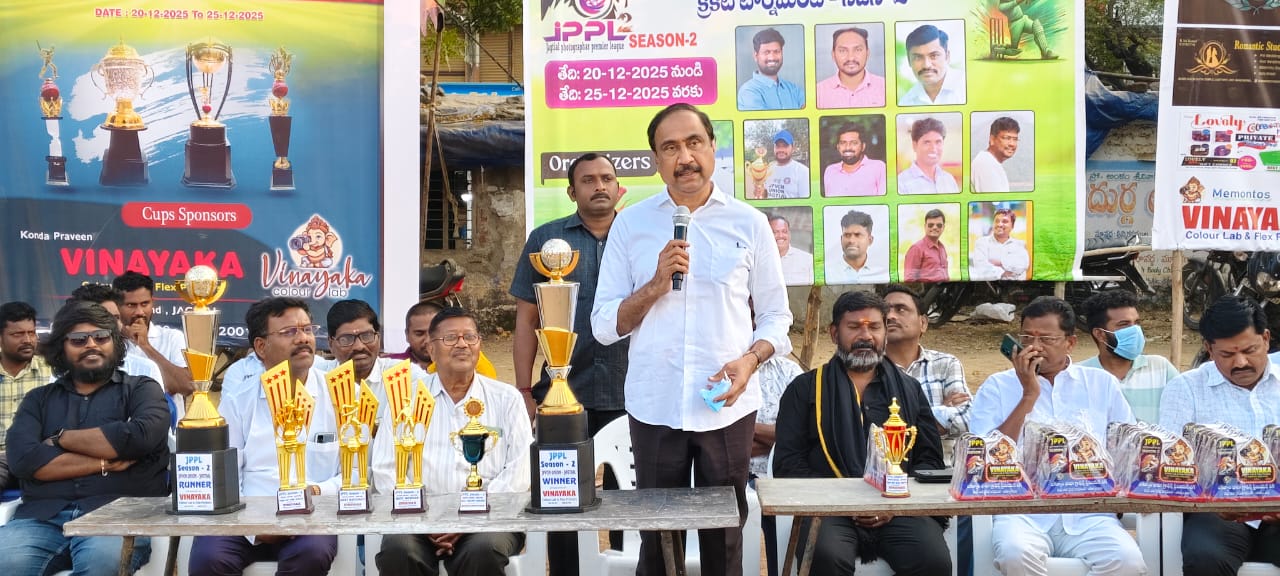 నేటి సాక్షి – జగిత్యాల టౌన్(పూరెళ్ల బాపు)……………………………………జగిత్యాల పట్టణ వివేకానంద మినీ స్టేడియంలో జగిత్యాల జిల్లా ఫోటోగ్రాఫర్స్ ప్రీమియర్ లీగ్ క్రికెట్ టోర్నమెంట్ సీజన్ – 2 ముగింపు కార్యక్రమానికి ఎం ఎల్ ఏ డాక్టర్ సంజయ్ కుమార్ హాజరై గెలుపొందిన విజేతలకు చెక్కులతో పాటు, బహుమతులు ప్రధానం చేసినారు.ఈ సందర్బంగా సంజయ్ కుమార్ మాట్లాడుతూ క్రీడలు నిత్య జీవితంలో ఎంతో ఉపయోగపడుతాయి అన్నారు.ఈ కార్యక్రమంలో నాయకులు ఆడువాళ లక్ష్మణ్, బాల ముకుందం ,రూరల్ మండల సర్పంచుల పోరం అధ్యక్షులు కట్ట రాజేందర్, లావుడ్యా సురేందర్ నాయక్,చిక్రంమారుతి,శ్రీనివాసరావు, గంగాధర్,హరీష్, ఫోటోగ్రాఫర్స్ అసోసియేషన్ కార్యవర్గ సభ్యులు తదితరులు పాల్గొన్నారు.