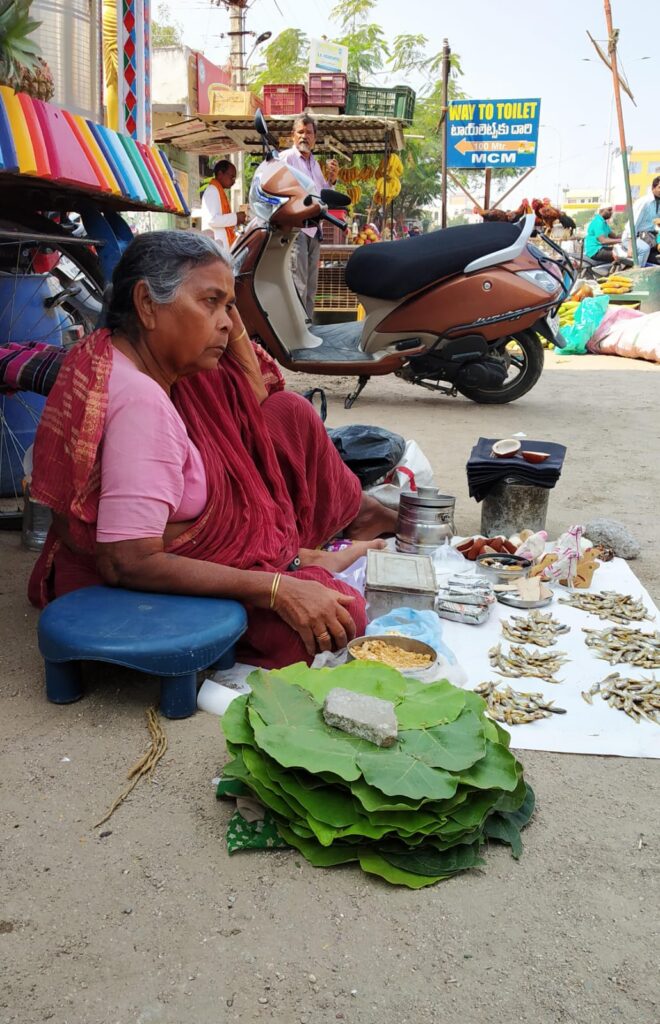 ‘ఎండురొయ్యపొట్టు’ డబ్బల.’బుకగులాల పొట్లాలు’.’నల్లకనుములు’.’కుడుకలు’..ఓ ‘తట్టుబొంతల’ వోసుకుని ఎల్లమ్మ కాడికి వొయ్యే తొవ్వల మూలమీద మంగుళారం మంగుళారం కూసుంటది.