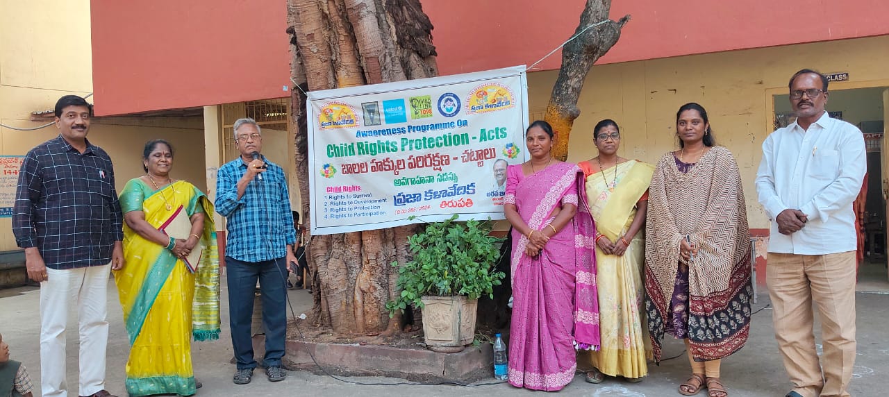 నేటి సాక్షి తిరుపతి (బాదూరు బాల)తిరుపతి, బాలల హక్కుల పరిరక్షణ బాధ్యత అందరిదీ అని ప్రజా కళావేదిక వ్యవస్థాపక ఛైర్మన్ అరవ జయపాల్ అన్నారు. తల్లిదండ్రులు, ఉపాధ్యాయులకు బాలల హక్కులు, చట్టాల గురించి అవగాహనా సదస్సులు నిర్వహిస్తున్నామన్నారు. స్థానిక ఎంసిహెచ్ యస్ మాడవీధిలో ప్రజా కళావేదిక ఆధ్వర్యంలో నిర్వహించిన సభకు హెడ్మాష్టర్ కె. ఆనందకుమార్ అధ్యక్షత వహించారు. ఈ కార్యక్రమంలో ఇంచార్జి హెచ్ ఎం కె. సోమ శేఖర్ రెడ్డి, టీచర్లు కె. వరలక్ష్మి (తెలుగు పండిట్), సునీత (సోషల్ స్టడీస్), పిడి సుధ తదితరులు పాల్గొన్నారు. ఈ సందర్బంగా జయపాల్ మాట్లాడుతూ, బాలల హక్కుల గురించి ప్రజల్లో చైతన్యం, అవగాహన కల్పించటం కోసం ప్రతి ఏటా నవంబరు 20వ తేదీన అంతర్జాతీయ బాలల హక్కుల పరిరక్షణ దినోత్సవాన్ని ప్రపంచ వ్యాప్తంగా నిర్వహిస్తారన్నారు. బాలల సంరక్షణ దేశానికి చాలా ముఖ్యమన్నారు. బాలల హక్కులను పరిరక్షించడం అందరి బాధ్యత అని, సమాజంలో ప్రతి ఒక్కరు ఈ హక్కుల పరిరక్షణ కోసం పాటుపడాలనీ అన్నారు. విద్య అనేది ప్రతి భారతీయ పౌరుడి యొక్క ప్రాథమిక హక్కు అని, విద్య ప్రతి ఒక్కరికీ మౌలికస్థాయిలో ఉచితంగా లభించాలనీ పేర్కొన్నారు. నిర్భంధంగానైనా బాలలందరికీ విద్యా హక్కు అమలయినప్పుడే నవభారతంలో కాబోయే నూతన పౌరులు దేశాన్ని రక్షించుకోగలగుతారన్నారు. బాల కార్మికుల సమస్య కొంతవరకూ తగ్గినప్పటికీ పూర్తిగా మాసిపోలేదన్నారు. భారత రాజ్యాంగం ప్రకారం, బాలల సంక్షేమం కొరకు పార్లమెంటు కొన్ని చట్టాలు చేసిందన్నారు. జువైనల్ జస్టిస్ చట్టం, బాల కార్మికుల నిషేధ చట్టం, న్యాయసేవల చట్టం, ఉచిత నిర్భంధ ప్రాధమిక విద్య హక్కు, బాలల అక్రమ రవాణా నిషేధ చట్టం, శిశు నిర్ధారణ పరీక్షల నిషేధ చట్టం, శిశు పౌష్టికాహార ఉత్పత్తి, సప్లై చట్టం వంటి ఎన్నో చట్టాలను చేసిందన్నారు. రాజ్యాంగం లోని ఆర్టికల్ 15 ద్వారా పిల్లల సంక్షేమానికి ప్రత్యేకమైన నిబంధనలు రూపొందించవచ్చనీ, సమానత్వ హక్కు ఆర్టికల్ 14 ద్వారా, వివక్షకు వ్యతిరేకంగా హక్కు ఆర్టికల్ 15 ద్వారా వ్యక్తిగత స్వేచ్చ, న్యాయ ప్రక్రియ యొక్క హక్కు ఆర్టికల్ 21 ద్వారా, అక్రమ రవాణా నుంచి రక్షించబడే హక్కు ఆర్టికల్ 23 ద్వారా బాలలకు హక్కులు ఏర్పరచబడ్డాయన్నారు. పిల్లలకు కూడా పెద్ద వారితో సమానంగా పన్నెండు బాలల హక్కులు ఇవ్వబడ్డాయన్నారు. పిల్లల హక్కుల పరిరక్షణకు తల్లిదండ్రులు, సంరక్షకులు బాధ్యత వహించాలన్నారు. ప్రపంచ వ్యాప్తంగా బాలల హక్కుల పట్ల పెద్ద ఎత్తున చర్చ జరుగుతున్నా గాని, ఆచరణలో సాధ్యం కావటం లేదన్నారు. బాలల హక్కుల గురించి భారత రాజ్యాంగంలో ఎన్నో అంశాలు పొందుపరచారన్నారు.