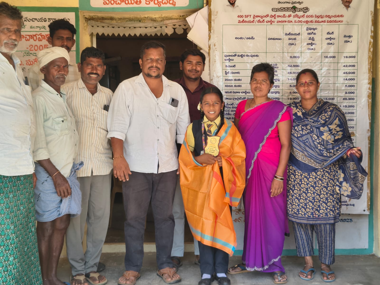 *నేటి సాక్షి, జగిత్యాల ప్రతినిధి:* ( గుండ ప్రశాంత్ గౌడ్ )జగిత్యాల జిల్లా గొల్లపల్లి మండలం అబ్బాపూర్ గ్రామంలో ధోమ్మాటి రాము హారిక వాళ్ళ కుమార్తె శ్రీహన్సీ ఇటీవల కరీంనగర్ లో భరతనాట్యం కాంపిటీషన్స్ ఉగాది పురస్కారాలు భాగంగా జాతీయ అవార్డు వచ్చిన సందర్భంగా గ్రామ పంచాయతీ తరపున ఒక చిన్న సత్కారం చేయడం జరిగింది ఈ కార్యక్రమంలో గ్రామ సర్పంచ్ ఉప సర్పంచ్ కార్యదర్శి మరియు పాలకవర్గం పాల్గొనడం జరిగింది