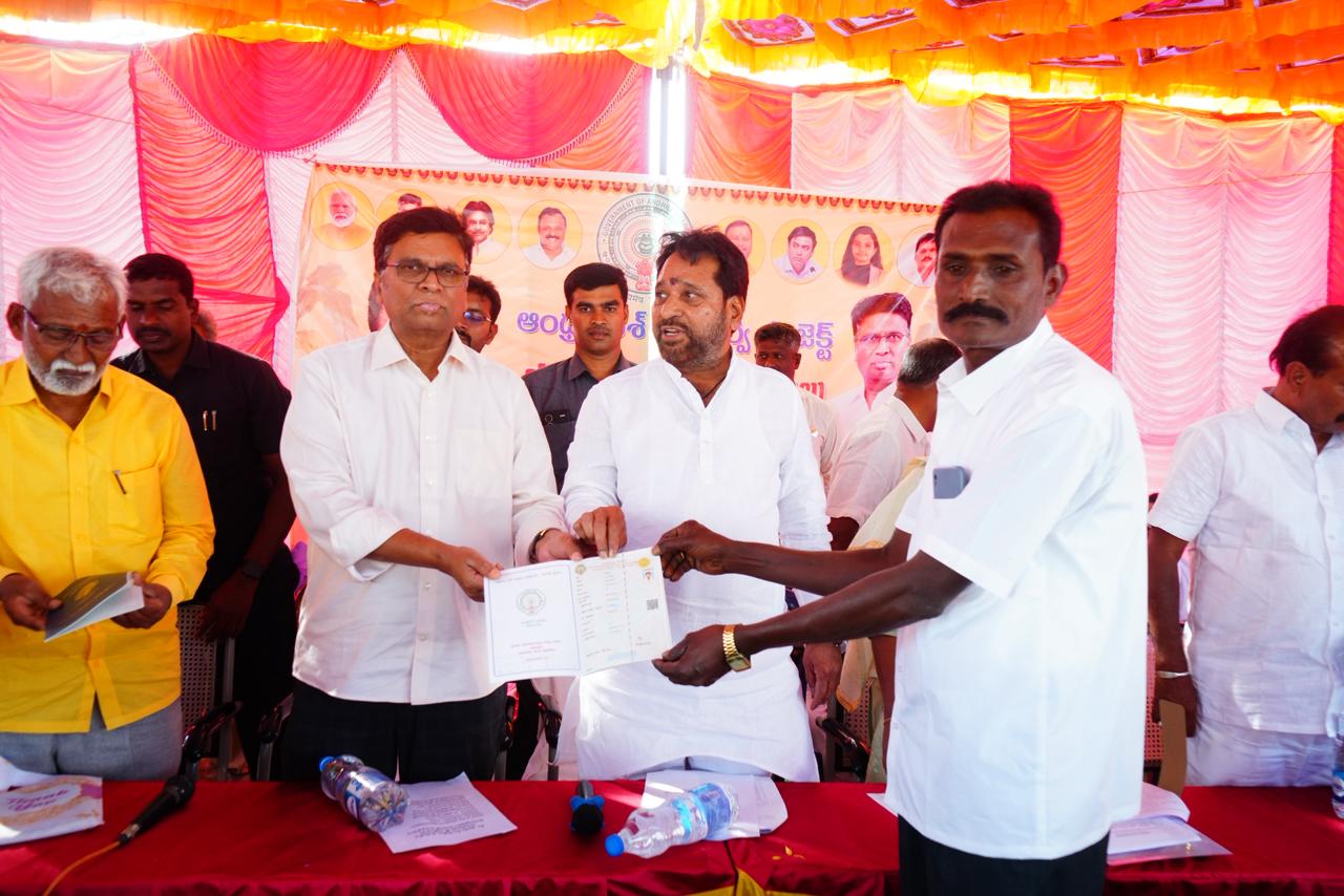 నేటి సాక్షి తిరుపతి *పలమనేరు*భూ భద్రత కల్పించడం కోసమే రాజ ముద్రతో కూడిన పట్టాదారు పొస్ పుస్తకాలను లబ్ది దారులకు కూటమి ప్రభుత్వం పంపిణీకి చేస్తోందనీ..,ఇది ముఖ్యమంత్రి చంద్రబాబు నాయుడు చిత్తశుద్ధికి నిదర్శనం అని చిత్తూరు పార్లమెంటు సభ్యులు దగ్గుమళ్ళ ప్రసాదరావు, పలమనేరు ఎమ్మెల్యే అమర్నాథ్ రెడ్డి కొనియాడారు. పారదర్శకతతో కూడిన పట్టాదారు పొస్ పుస్తకాలను అందించడం పై అధికారులు దృష్టి సారించి, భూ యజమానులకు ఎటువంటి ఎటువంటి సమస్యకు తావులేకుండా చూడాలని వారు సూచించారు. లబ్దిదారులకు సర్వహక్కులు కల్పిస్తూ.., గత వైకాపా ప్రభుత్వం హయాంలో పట్టాదారు పొస్ పుస్తకాల పై ఉన్న మాజీ సిఎం జగన్మోహన్ రెడ్డి ఫోటోను తీసి వేయించి, మంచి పని చేసిందన్నారు. అంతేకాకుండా భూమి పై ప్రజలకు సర్వహక్కులను కల్పిస్తూ పట్టాదారు పుస్తకాలకు రూపకల్పన చేయడం అభినందించదగ్గ విషయమన్నారు.పలమనేరు నియోజకవర్గం, పెద్దపంజాణి మండలం, పెద్దవెలగటూరులో నిర్వహించిన రాజముద్రతతో కూడిన పట్టాదారు పాసుపుస్తకాల పంపిణీ కార్యక్రమానికి చిత్తూరు పార్లమెంటు సభ్యులు దగ్గుమళ్ళ ప్రసాదరావు, పలమనేరు ఎమ్మెల్యే అమర్నాథ్ రెడ్డి ముఖ్య అతిథులుగా హాజరై, లబ్ధిదారులకు రాజ్యముద్రతో కూడిన పట్టాదారు పుస్తకాలను పంపిణీ చేశారు.ఈ సందర్భంగా చిత్తూరు ఎంపీ దగ్గుమళ్ళ ప్రసాదరావు, పలమనేరు ఎమ్మెల్యే అమర్నాథ్ రెడ్డి మాట్లాడుతూ.. 2024 సార్వత్రిక ఎన్నికల్లో కూటమి ప్రభుత్వం ఇచ్చిన హామీ మేరకు ఉన్నత ఆశయంతో రూపకల్పన చేసిన పట్టాదారు పాస్ పుస్తకాలను లబ్ధిదారులకు పంపిణీ చేయడం జరిగిందన్నారు.గత వైకాపా ప్రభుత్వ హయాంలో అప్పటి ముఖ్యమంత్రి జగన్మోహన్ రెడ్డి ప్రజల ఆస్తులకు సంబంధించిన పట్టాదారు పాస పుస్తకాల పై తన ఫోటో ముద్రించుకొని భూములను కాజేయాలని చూశారని, అయితే ప్రజలు జగన్మోహన్ రెడ్డికి గట్టి గుణపాఠం చెప్పి, కూటమి ప్రభుత్వానికి పట్టం కట్టారని గుర్తు చేశారు. ఈ నేపథ్యంలో ప్రజలకు ఇచ్చిన హామీ మేరకు భూ భద్రత కల్పిస్తూ రాజముద్రతో కూడిన పట్టాదారు పాసుపుస్తకాలను లబ్ధిదారులకు కూటమి ప్రభుత్వం అందిస్తుందన్నారు.పట్టాదారు పాస్ పుస్తకాలలో ఏదైనా సమస్య ఉన్నా, ఈ సబ్బులు ఆ సమస్యకు పరిష్కారం మార్గాన్ని కూడా చూపే దిశగా అధికారులు పనిచేస్తున్నారని తెలిపారు.మరి ముఖ్యంగా అధికారులు పట్టాదారు పాస్ పుస్తకాలలో తప్పులకు అవకాశం లేకుండా పారదర్శకతతో కూడిన పట్టాదారు పొస్ పుస్తకాలను సిద్ధం చేసి లబ్ధిదారులకు అందించాలని ఎంపీ, ఎమ్మెల్యేలు ఆదేశించారు. ఈ విషయంలో అధికారులు అలసత్వం వహిస్తే..ప్రభుత్వానికి అపఖ్యాతి వచ్చే ప్రమాదం ఉందని, ఈ విషయాన్ని అధికారులు గుర్తుతెరిగి తమ కర్తవ్యాన్ని చిత్తశుద్ధితో నిర్వర్తించాలని త
