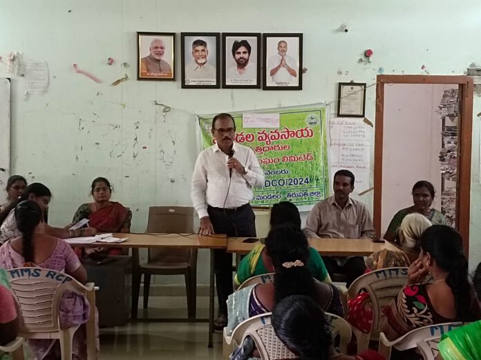 నేటి సాక్షి తిరుపతి (బాదూరు బాల) *రామచంద్రపురం* మహిళ రైతుల అభివృద్ధే ప్రభుత్వ లక్ష్యమని డి ఆర్ డి ఎ ప్రాజెక్ట్ డైరెక్టర్ టి ఎన్ శోభన్ బాబు అన్నారు శనివారం మండల మహిళా సమాఖ్య కార్యాలయంలో ఏర్పాటు చేసిన మహిళా రైతులతో సమావేశం కార్యక్రమంలో భాగంగా ప్రభుత్వ సహకారంతో (ఎఫ్ పి ఓ) ఏర్పాటు కోసం అవగాహన కార్యక్రమం నిర్వహించారు ఈ కార్యక్రమంలో డి ఆర్ డి ఏ ప్రాజెక్ట్ డైరెక్టర్ మాట్లాడుతూ ఎఫ్. పి. ఓ ఏర్పాటు చేయడం వల్ల రైతులే గిట్టుబాటు ధర నిర్ణయించుకోవచ్చు, రైతులు పండించే పంటలు,కాయగూరలకు మార్కెటింగ్ కల్పించుకోవాలి రైతులకు కావాల్సిన యాంత్రికరణ వస్తువులను కొనుగోలు చేసుకోవచ్చు, రైతులకు కావాల్సిన సాంకేతిక పరిజ్ఞానంతో కూడిన శిక్షణలు పొంది తక్కువ పెట్టుబడి తో అధిక ఆదాయం వచ్చే పంటలను సాగు చేసి అధిక దిగుబడులు గణనీయంగా పెరుగుతోందని అన్నారు, దీనివల్ల దళారీ వ్యవస్థను పూర్తిగా అరికట్టవచ్చును. కాబట్టి ప్రభుత్వం కల్పించిన ఎఫ్.పి.ఓ నందు మండలం లో ఉన్న మహిళా రైతులు ( ఎఫ్.పి. జి) వ్యవసాయ ఉత్పత్తిదారుల సంఘాలు గా ఏర్పాటు చేసుకొని ఎఫ్ .పి. ఓ తో రైతులు అభివృద్ధి చెందాలని ఆయన ఆకాంక్షించారు. ఈకార్యక్రమంలో మహిళలు ఏపిఎం గురుమూర్తి, ఎఫ్. పి. ఓ అధ్యక్షురాలు లక్ష్మి,మహిళా రైతులు, సి సి లు పార్వతమ్మ, సుధాకర్ అరుణ అకౌంటెంట్ స్వర్ణలత, తదితరులున్నారు