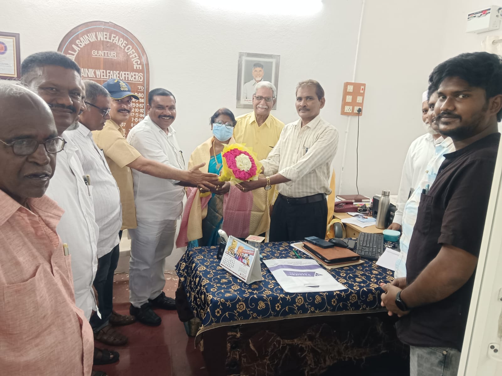 నేటి సాక్షి, బాపట్ల జిల్లా ప్రతినిధి గుంటూరు, బాపట్ల మరియు పల్నాడు జిల్లాల లోని మాజీ సైనికుల సమస్యలపైన మరియు మాజీ సైనికుల కుటుంబ సభ్యులకు అందుతున్న సంక్షేమం పైన వాకబు చేస్తూ, గుంటూరు లో ఆంధ్ర ప్రదేశ్ రాష్ట్ర మాజీ సైనిక సంక్షేమ సంఘం యొక్క స్టేట్ కమిటీ చేసిన పర్యటన విజయవంతం అయినట్లు రాష్ట్ర మాజీ సైనిక సంక్షేమ సంఘం అధ్యక్షులు తాండ్ర సాంబశివరావు తెలిపారు. తమ పర్యటన లో భాగంగా గుంటూరు జిల్లా సైనిక్ వెల్ఫేర్ కార్యాలయాన్ని మరియు మాజీ సైనికుల వైద్యశాల అయినటువంటి ECHS పాలిక్లినిక్ ను సందర్శించినట్లు రాష్ట్ర అధ్యక్షులు తాండ్ర సాంబశివరావు తెలియ జేశారు. రాష్ట్ర కమిటీ గుంటూరు పర్యటన లో భాగంగా గుంటూరు, బాపట్ల మరియు పల్నాడు జిల్లాల లోని పలు అసోసియేషన్ ల ప్రతినిధులు స్టేట్ కమిటీ ప్రతినిధులను మర్యాదపూర్వకంగా కలిసి, పర్యటనలో భాగస్వాములు కాగా, వాతావరణ పరిస్థితుల దృష్ట్యా గుంటూరుకు చేరుకోలేని కొన్ని అసోసియేషన్ ల ప్రతినిధులు ఫోన్ ల ద్వారా స్టేట్ కమిటీకి తమ యూనియన్ ల విషయాలను జిల్లాలో జరుగుతున్న పరిస్థితులను తెలియ జేశారు.గుంటూరు జిల్లా పర్యటనలో భాగంగా, గుంటూరు జిల్లా సైనిక్ వెల్ఫేర్ కార్యాలయానికి చేరుకోగా, జిల్లా సైనిక్ వెల్ఫేర్ ఆఫీసర్ శ్రీమతి గుణ షీలా, సైనికులకు/ మాజీ సైనికులకు మరియు మాజీ సైనికుల కుటుంబ సభ్యులకు తమ కార్యాలయంలో అందిస్తున్న సేవల గురించి వివరించారు.ఈ సందర్భంగా రాష్ట్ర అధ్యక్షులు తాండ్ర సాంబశివరావు మాట్లాడుతూ, ఉమ్మడి గుంటూరు జిల్లా లోని జిల్లా సైనిక్ వెల్ఫేర్ ఆఫీసు పని తీరు అద్భుతంగా ఉందని తెలియ జేశారు. ముఖ్యంగా గుంటూరు జిల్లా సైనిక్ వెల్ఫేర్ ఆఫీసు ప్రాంగణంలో మాజీ సైనికుల కోసం షుమారు రెండు కోట్ల తొంబై రెండు లక్షల (2,92,00000/_)రూపాయల తో భారీగా నిర్మిస్తున్న సైనిక్ ఆరామ్ ఘర్ నూతన భవన నిర్మాణ పనులను జిల్లా సైనిక్ వెల్ఫేర్ ఆఫీసర్ శ్రీమతి గుణ షీలా మరియు సూపరింటెండెంట్ ఆనందరావు లతో కలిసి రాష్ట్ర అధ్యక్షులు తాండ్ర సాంబశివరావు బృందం పరిశీలించి సంతృప్తిని వ్యక్త పరిచారు. మాజీ సైనికుల సంక్షేమం కోసం గుంటూరు లో ఇంత పెద్ద నిర్మాణాన్ని చేపడుతున్న కేంద్ర రాష్ట్ర ప్రభుత్వాలకు మరియు ఆంధ్రప్రదేశ్ రాజ్య సైనిక్ బోర్డు వారికి అదేవిధంగా ఢిల్లీ కేంద్రంగా పని చేస్తున్న కేంద్ర సైనిక్ బోర్డు వారికి కూడా ఆంధ్ర ప్రదేశ్ రాష్ట్ర మాజీ సైనిక సంక్షేమ సంఘం తరపున అధ్యక్షులు తాండ్ర ధన్యవాదాలు తెలిపారు. మాజీ సైనికుల కోసం నిర్మిస్తున్న సైనిక్ ఆరామ్ ఘర్ నిర్మాణ పనులను ఎప్పటికప్పుడు పర్యవేక్షిస్తూ, చాకచక్యంగా వ్యవహరిస్తూ కలెక్టర్ స్థాయి అధికారులకు కూడా వాస్తవాలను, అవశ్యకతలను తెలియ జేసి, జిల్లాసైనిక్ వెల్ఫేర్ కార్యాలయానికి 