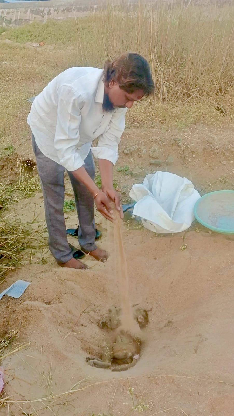 నేటి సాక్షి – రాజన్న సిరిసిల్ల*మనిషి–జంతువు మధ్య అనుబంధాన్ని మరోసారి చాటిచెప్పే ఘటన రాజన్న సిరిసిల్ల జిల్లా కేంద్రంలో చోటుచేసుకుంది. రహదారి పక్కన నిర్లక్ష్యంగా పడి ఉన్న వానరానికి గౌరవప్రదంగా అంత్యక్రియలు నిర్వహించి, మానవత్వం ఇంకా బ్రతికే ఉందని నిరూపించారు భవన నిర్మాణ కార్మిక సంఘం నాయకులు.*కరెంట్ షాక్తో వానరం మృతి*రాజన్న సిరిసిల్ల జిల్లా కేంద్రంలోని గాంధీనగర్ పరిధిలో, హెచ్డీఎఫ్సీ బ్యాంక్ వెనుకభాగంలో ఉన్న ఎయిర్టెల్ టవర్ సమీపంలో శుక్రవారం సాయంత్రం సుమారు నాలుగు గంటల సమయంలో ఓ వానరం విద్యుత్ షాక్కు గురై మృతి చెందినట్లు స్థానికులు తెలిపారు. రోడ్డుపై వానరం మృతదేహం పడి ఉన్నప్పటికీ ఎవరూ పట్టించుకోకపోవడం స్థానికంగా చర్చనీయాంశంగా మారింది.*మనసు కదిలిన కార్మిక సంఘ నాయకుడు*అదే సమయంలో అటుగా వెళ్లిన భవన నిర్మాణ కార్మిక సంఘం రాజన్న సిరిసిల్ల జిల్లా అధ్యక్షులు అక్కెనపెల్లి భాస్కర్ ఈ ఘటనను గమనించారు. మృత వానరాన్ని చూసి చలించిపోయిన ఆయన, అది నిర్లక్ష్యానికి గురికాకూడదని నిర్ణయించారు. వెంటనే తన సహచరుల సహకారంతో వానరాన్ని అక్కడి నుంచి తీసుకెళ్లారు.*గౌరవప్రదంగా అంత్యక్రియలు*వానరానికి తగిన విధంగా అంత్యక్రియలు నిర్వహించాలనే సంకల్పంతో అక్కేనాపెల్లి భాస్కర్ వాగు వద్దకు తీసుకెళ్లి సంప్రదాయబద్ధంగా అంత్యక్రియలు నిర్వహించారు. ఈ కార్యక్రమంలో బైరగోని శ్రీనివాస్, ఎస్కే జహీర్, ఎదుల్లా భద్ర, చిలుక నర్సింలు పాల్గొని మానవత్వానికి మద్దతుగా నిలిచారు.*సమాజానికి సందేశం*జంతువుల పట్ల కూడా మనుషుల్లాగే గౌరవం చూపించాల్సిన అవసరం ఉందని, ప్రతి ప్రాణానికి విలువ ఉంటుందనే సందేశాన్ని ఈ ఘటన స్పష్టంగా చాటిందని స్థానికులు అభిప్రాయపడ్డారు. రహదారులపై, ప్రజా ప్రదేశాల్లో జంతువులు మృతి చెందినప్పుడు బాధ్యతగా స్పందించాల్సిన అవసరం ఉందని పలువురు పేర్కొన్నారు.—–