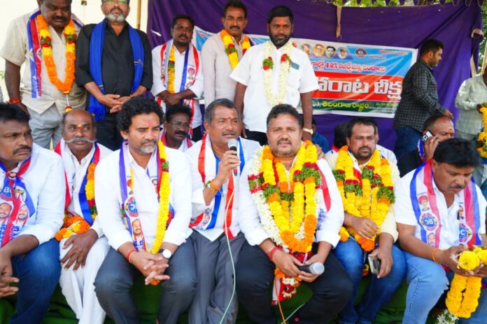 నేటిసాక్షి, మిర్యాలగూడ : తెలంగాణ రాష్టంలో బీసీ లకు 42% రిజర్వేషన్ కల్పించేందుకు బీసీ జేఏసీల ఆధ్వర్యంలో గురువారం పట్టణంలోని సబ్ కలెక్టర్ కార్యాలయంలో ఆవరణలో ధర్మ పోరాట దీక్ష నిర్వహించారు. ఈ దీక్ష కు మద్దతుగా స్థానిక శాసనసభ్యులు బత్తుల లక్ష్మారెడ్డి పాల్గొన్నారు. ఈ సందర్భంగా ఆయన మాట్లాడుతూ, కాంగ్రెస్ పార్టీ ఇచ్చిన మాట ప్రకారం కుల గణన నిర్వహించి, సామాజిక న్యాయం చేయాలని స్థానిక సంస్థల్లో బీసీ లకు 42% రిజర్వేషన్ ఇవ్వాలని ప్రత్యేక జీవో ఏర్పాటు చేసినా కూడా, కేంద్ర ప్రభుత్వం ఆమోదించకుండా, తెలంగాణలోని బడుగు, బలహీన వర్గాలకు అన్యాయం చేస్తుందని ఆరోపించారు. ఈ కార్యక్రమంలో రాష్ట్ర కాంగ్రెస్ నాయకులు స్కైలాబ్ నాయక్, బిసి సంఘం నాయకులు జాజుల లింగం గౌడ్, మహేష్, బిసి సంఘం నేతలు, కాంగ్రెస్ నేతలు తదితరులు పాల్గొన్నారు.