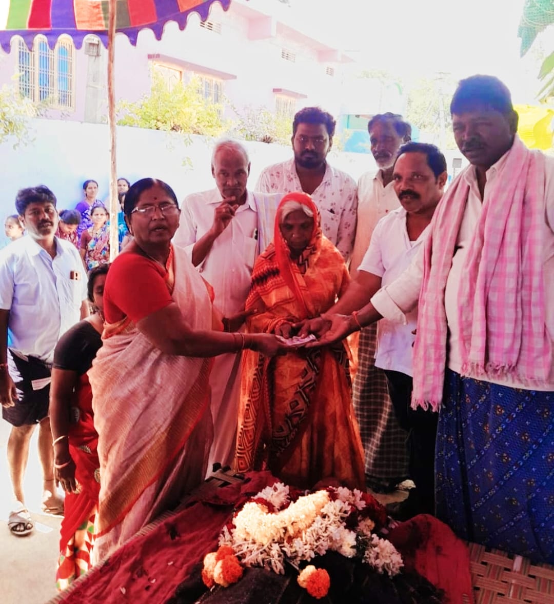 నేటి సాక్షి జనవరి 12 పాములపాడు :—వేంపెంట గ్రామంలో మృతిచెందిన టిడిపి పార్టీ కార్యకర్త పట్నం సత్యమయ్య పార్థివ దేహానికి వేంపెంట మాజీ సర్పంచ్ టేకూరి రామసుబ్బమ్మ పూలమాలలు వేసి ప్రగాడ సంతాపం తెలిపారు.కుటుంబానికి ప్రగాఢ సానుభూతి తెలిపి రూ.5వేలు ఆర్థిక సాయం అందించారు.ధైర్యంగా ఉండాలని అన్ని విధాలుగా తోడుగా ఉంటామని కుటుంబానికి భరోసా ఇచ్చారు.ఈ కార్యక్రమంలో (డిసి)వైస్ చైర్మన్ ఆల్ఫ్రెడ్ మాజీ ఉప సర్పంచ్ సత్యరాజు,మాజీ ఎంపిటిసి శివకుమార్,రాజేష్,ప్రసాద్ రత్నాకర్, కొప్పుల సుధాకర్, సురేష్,పట్నం యోసేపు,కృష్ణ,పట్నం నాగన్న,బోనపల్లె రమేష్ తదితరులు పాల్గొన్నారు.