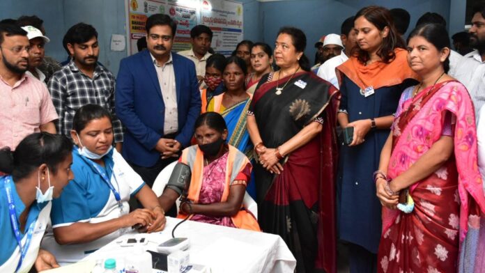 మెగా ఆరోగ్య శిబిరాన్ని సద్వినియోగం చేసుకోవాలని నగర మేయర్ గుండు సుధారాణి పేర్కొన్నారు. శుక్రవారం బల్దియాలోని ఇండోర్ స్టేడియంలో 100 రోజుల కార్యక్రమాల్లో భాగంగా జిడబ్ల్యుఎంసి, మెడి కవర్ ఆసుపత్రి సంయుక్త ఆధ్వర్యంలో పారిశుద్ధ్య, మెప్మా సిబ్బందికి ఏర్పాటు చేసిన మెగా ఉచిత వైద్య శిబిరాన్ని కమిషనర్ డాక్టర్ అశ్వినీ తానాజీ వాఖేడే తో కలసి మేయర్ గుండు సుధారాణి ప్రారంభించారు. ఈ సందర్భంగా మేయర్ మాట్లాడుతూ రాష్ట్ర ముఖ్యమంత్రి రేవంత్ రెడ్డి సారధ్యంలో రాష్ట్రంలోని మున్సిపల్ కార్పొరేషన్లు, మున్సిపాలిటీలలో ప్రజలకు మెరుగైన సేవలు అందించడంతో పాటు కార్యక్రమాల అమలు చేయాలని ఉద్దేశంతో తెలంగాణ రైజింగ్ 2047 పేరుతో పట్టణ స్థానిక సంస్థల్లో జూన్ 2వ తేదీ నుండి సెప్టెంబర్ 10వ తేదీ వరకు 100 రోజుల ప్రణాళిక అమలు చేయడం జరుగుతుందన్నారు. ఈ కార్యక్రమాల్లో భాగంగా పరిశుభ్రమైన, ఆరోగ్య వంతమైన ఎలాంటి విపత్తులను ఎదుర్కొనే విధంగా వరంగల్ మహా నగర పాలక సంస్థను నిర్మించే దిశగా చేస్తున్న కృషి లో ప్రతిరోజు ‘ఒక చర్చ ఒక మార్పు’ అనే నినాదంతో ముందుకెళుతున్నామన్నారు. బల్దియాలో మౌలిక సదుపాయాలు ప్రజల భాగస్వామ్యాన్ని పెంచి ప్రజలే ముందు అనే నినాదంతో స్థిరమైన పట్టణాభివృద్ధి సాధించడమే లక్ష్యంగా పనిచేస్తున్నట్లు మేయర్ తెలిపారు. ముఖ్యమంత్రి రేవంత్ రెడ్డి మహిళా ఆరోగ్యంగా ఉంటేనే కుటుంబం తద్వారా సమాజం ఆరోగ్యంగా ఉంటుందనే ఉద్దేశంతో ఎన్నో సంక్షేమ అభివృద్ధి పథకాలు అమలు చేస్తున్నారన్నారు. ఈ వంద రోజుల కార్యక్రమాల భాగంగా శుక్రవారం పారిశుద్ధ్య, మెప్మా సిబ్బంది ఆరోగ్య పరిరక్షణ లక్ష్యంగా మెడికవర్ ఆసుపత్రి సహకారంతో మెగా హెల్త్ క్యాంప్ నిర్వహిస్తున్నట్లు తెలిపారు. ఈ మెగా హెల్త్ క్యాంప్ లో డయాబెటిక్ ఆర్తో కార్డియో జనరల్ ఆరోగ్య చెకప్ లతో పాటు దానికి సంబంధించిన పరీక్షలు నిర్వహించి ఉచితంగా మందులు పంపిణీ చేయడం జరుగుతుందన్నారు. ఈ సందర్భంగా స్వయంగా డాక్టర్ ఆయిన కమిషనర్ మేయర్ కు ఆరోగ్య పరీక్షలు చేశారు. కమిషనర్ డాక్టర్ అశ్విని తానాజీ వాకడే మాట్లాడుతూ 100 రోజుల కార్యక్రమంలో భాగంగా నిర్వహిస్తున్న మెగా వైద్య శిబిరాన్ని పారిశుద్ధ్య కార్మికులు మెప్మా సిబ్బంది సద్వినియోగం చేసుకోవాలన్నారు. గ్రేటర్ వరంగల్ నగరాభివృద్ధిలో నగర ప్రజలు భాగస్వాములై