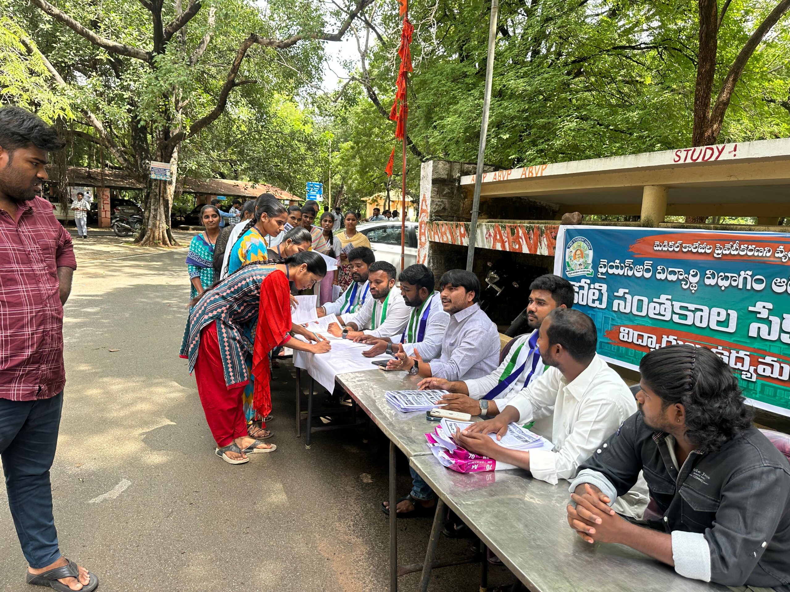 నేటి సాక్షి తిరుపతి (బాదూరు బాల) ప్రభుత్వ మెడికల్ కాలేజీలను కూటమి ప్రభుత్వం ప్రయివేటు పరం చేయడాన్ని వ్యతిరేకిస్తూ రాష్ట్ర వైఎస్ఆర్ కాంగ్రెస్ పార్టీ ఇచ్చిన పిలుపు మేరకు చేపట్టిన కోటి సంతకాల సేకరణ అట్టహాసంగా ప్రారంభమైంది. వైఎస్ఆర్ కాంగ్రెస్ పార్టీ జిల్లా విద్యార్థి విభాగం అధ్యక్షులు చెవిరెడ్డి హర్షిత్ రెడ్డి ఆధ్వర్యంలో సంతకాల సేకరణ చేపట్టగా ఒకే రోజు వెయ్యి మంది తమ సంతకం పెట్టి మద్దతు తెలిపారు. ప్రయివేటీకరణను వ్యతిరేకిస్తూ చేస్తున్న సంతకాల సేకరణకు ప్రజల నుంచి స్పందన లభిస్తుండటంతో పార్టీ నేతలు మరింత ఉత్సాహంగా ఆ కార్యక్రమాన్ని జనం మద్యకు తీసుకువెళుతున్నారు. చంద్రగిరి నియోజకవర్గ వ్యాప్తంగా కోటి సంతకాల సేకరణకు పార్టీ నేతలు, కార్యకర్తలు సన్నద్ధమవుతున్న తరుణంలో చంద్రగిరి నియోజకవర్గంకు చెందిన విద్యార్థి విభాగం నేతలు ఎస్వీయూ ప్రధాన ద్వారం వద్ద చేపట్టిన సంతకాల సేకరణకు పెద్ద ఎత్తున స్పందన లభించింది. విద్యార్థి విభాగం జిల్లా అధ్యక్షులు చెవిరెడ్డి హర్షిత్రెడ్డి ఆద్వర్యంలో చంద్రగిరి నియోజకవర్గంలోని అన్ని మండలాల విద్యార్థి విభాగం నేతలు వర్శిటీ వద్దకు చేరుకుని కూటమి ప్రభుత్వం వైద్యవిద్య, ప్రభుత్వ ఆసుపత్రిలను ప్రయివేటు పరం చేయాలని చేడటాన్ని ప్రజలకు అర్థమయ్యేలా వివరించారు. ప్రభుత్వ నిర్ణయాన్ని వ్యతిరేఖిస్తూ చేపడుతున్న చేపట్టే కోటి సంతకాల సేకరణలో భాగస్వాములు కావాలని విజ్ఞప్తి చేశారు. ఆ మేరకు ప్రజలతో పాటు వర్శిటీ విద్యార్థులు, విద్యావంతులు, మేధావులు సైతం తమ మద్దతును తెలిపుతూ సంతకాలు చేశారు. గురువారం ఉదయం 9గంటల నుంచి ప్రారంభమైన సంతకాల సేకరణ మధ్యాహ్నం 1గంటల వరకు జరిగింది. ఆ సమయంలో సుమారు వెయ్యి మంది స్వచ్ఛందంగా సంతకాలు పెట్టి తమ మద్దతు తెలియపరచడం చూస్తుంటే ప్రయివేటీకరణకు ఎంత మంది వ్యతిరేకంగా వున్నారన్న విషయం అర్థమవుతోంది. ఈ కార్యక్రమంలో చంద్రగిరి నియోజకవర్గం విద్యార్థి విభాగం అధ్యక్షులు చెంగల్ రెడ్డి, ఎస్వీ యూనివర్సిటీ విద్యార్థి విభాగం అధ్యక్షులు ప్రేమ కుమార్, విద్యార్థి విభాగం మండలాల అధ్యక్షులు నక్క హరినాథ్, శేష రెడ్డి, వెంకటరమణ నాయక్, వర్శిటీ విద్యార్థి నేతలు ముని, హరినాయక్ ,లిఖిత్ ,సతీష్, మహేష్, నవీన్, నీరజ్ రెడ్డి, సాయితదితరులు పాల్గొన్నారు.