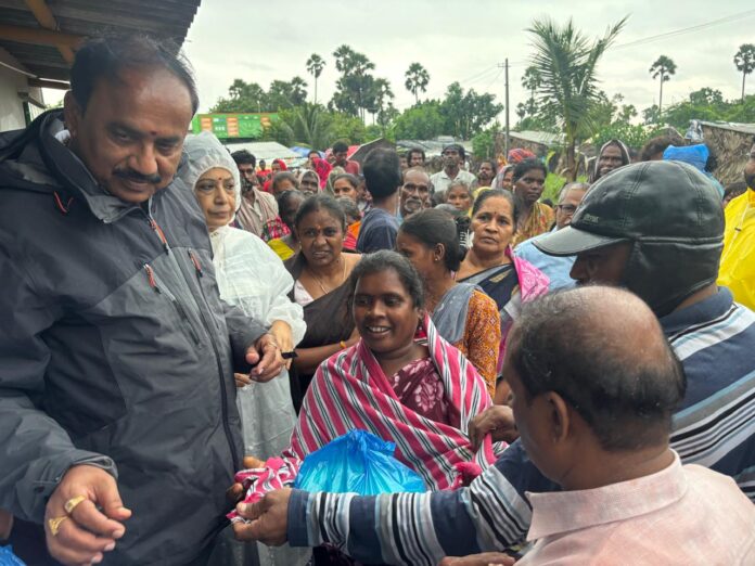 నేటి సాక్షి, బాపట్ల జిల్లా (చీరాల)మొంథా తుఫాన్ కారణంగా వరదకు గురయ్యే సెంటెన్స్ స్కూల్ , చేనేతపురి కాలనీ, తోటవారిపాలెం చంద్రమౌళి కాలనీ, దేశాయిపేట పంచాయితీ నవజ్యోతి కాలనీ నందు, ప్రజలకోసం ఏర్పాటుచేసిన పునరావాస కేంద్రాన్ని పరిశీలించి అక్కడ ఏర్పాటు చేసిన సధుపాయాలు తెలుసుకున్నారు, వారికి స్వయంగా భోజనం వడ్డించి అందరితో కలిసి భోజనం చేశారు. మరియు మెడికల్ ఎక్యూప్మెంట్ ని పరిశీలించారు.. తర్వాత చీరాల మున్సిపల్ కార్యాలయంలో అధికారులతో సమీక్ష సమావేశం నిర్వహించారు. లోటత్తు ప్రాంతాల్లో నివసిస్తున్న ప్రజలకు ఎలాంటి అసౌకర్యం కలగకుండా చూసుకోవాలని చెప్పారు . ఈ కార్యక్రమంలో NDA కూటమి నాయకులు, అధికారులు పాల్గొన్నారు.