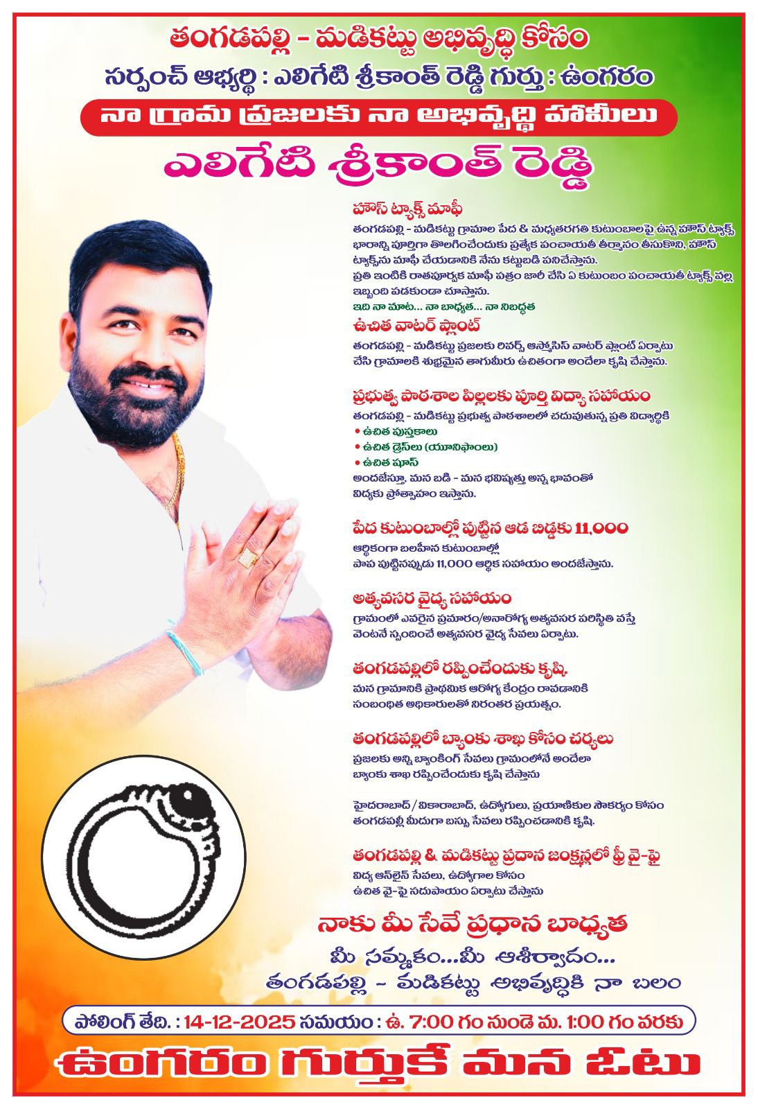 నేటి సాక్షి ప్రతినిధి చేవెళ్ల న్యూస్ *యువత దూకుడుతో ఎలిగేటి శ్రీకాంత్ రెడ్డి కి విశేష ఆదరణ*. *పేదల కోసం హామీల్లో స్పష్టత చూపుతున్న శ్రీకాంత్ రెడ్డి*. *ప్రజల నమ్మకాన్ని గెలుచుకుంటున్న ఉంగరం గుర్తు – ఎలిగేటి శ్రీకాంత్ రెడ్డి*తంగడపల్లి – మడికట్టు గ్రామాల్లో ఎన్నికల సందడి ఉరకలేస్తోంది. ఈ సందడిలో ప్రజల దృష్టిని బలంగా ఆకర్షిస్తున్న పేరు ఒక్కటే — ఉంగరం గుర్తుతో ముందుకు వచ్చిన సర్పంచ్ అభ్యర్థి ఎలిగేటి శ్రీకాంత్ రెడ్డి. ఇచ్చిన మాట తప్పకుండా, గ్రామ సమస్యల పట్ల నిజమైన పట్టుదల, అందరి మధ్యలో ఉండే సాదాసీదా స్వభావం ఆయనను ప్రజలకు మరింత దగ్గర చేసింది.ప్రచారంలో విశేషంగా కనిపిస్తున్న విషయమేమిటంటే యువత నుంచి వస్తున్న అత్యద్భుత మద్దతు. గ్రామం లో ఎక్కడ తిరిగిన… ప్రతి వీధిలోనూ… ప్రతి ఇంటి వద్ద… యువతే ముందుంటోంది. “మన గ్రామం కోసం నిజంగా పని చేసే మన మనిషి శ్రీకాంత్ అన్నగారు కావాలి” అని వారు ఉత్సాహంగా చెబుతున్నారు. బైకులపై తిరిగి ప్రచారం చేయడం, రాత్రివేళల వరకూ సమావేశాలు నిర్వహించడం, ప్రతి ఓటు కోసం ప్రజలకు ఆయన గురించి చెప్పడం — ఇలా యువతే ప్రచార బలం అయ్యింది. ఈ యువ శక్తి ప్రచారాన్ని గాలి కాదు… దుమారంగా మారుస్తోంది.గ్రామాల్లో పేద, మధ్యతరగతి కుటుంబాలు ఎన్నో ఏళ్లుగా ఎదుర్కొంటున్న హౌస్ పన్ను సమస్యకు శాశ్వత పరిష్కారం చూపుతానని శ్రీకాంత్ రెడ్డి స్పష్టంగా ప్రకటించారు. ప్రతి ఇంటికి రాతపూర్వకంగా హౌస్ పన్ను మాఫీ పత్రం ఇస్తానని చెప్పడంతో గ్రామాల్లో చర్చ చెలరేగింది. “పేదలపై పన్నుల భారమేమీ ఉండకూడదు” అనే ఆయన మాట ప్రజల్లో విశ్వాసాన్ని పెంచింది.తాగునీటి సమస్యను శాశ్వతంగా పరిష్కరించేందుకు ఉచిత నీటి శుద్ధి కేంద్రాన్ని ఏర్పాటు చేస్తానని ఆయన హామీ ఇచ్చారు. పరిశుభ్రమైన తాగునీరు లేక ఇబ్బంది పడుతున్న ప్రజలకు ఇది పెద్ద ఆశ. గ్రామంలో ప్రతి కుటుంబానికి శుద్ధమైన నీరు ఉచితంగా అందుబాటులోకి రానుందన్న విషయం ప్రజల్లో ఆనందాన్ని కలిగిస్తోంది.గ్రామ పిల్లల చదువు కోసం కూడా ఆయన ప్రత్యేకంగా ఆలోచించారు. ప్రభుత్వ పాఠశాలలో చదువుతున్న ప్రతి విద్యార్థికి ఉచిత పుస్తకాలు, చెప్పులు, చదువు సామగ్రి అందిస్తానని చెప్పారు. పాఠశాల పరిసరాల అభివృద్ధికి కట్టుబడి పనిచేస్తానని చెప్పడంతో విద్యార్థుల తల్లిదండ్రుల్లో సంతోషం స్పష్టంగా కనిపిస్తోంది.పేద కుటుంబాల్లో పుట్టే ఆడశిశువులకు జననం వెంటనే పదకొండు వేలు అందిస్తానన్న హామీ మహిళల్లో విశేష ఆదరణ పొందుతోంది. ఆడపిల్ల పుట్టుకకు గౌరవం పెరిగేలా, కుటుంబానికి భరోసా కలిగేలా ఆయన తీసుకువస్తున్న ఈ నిర్ణయం గ్రామ మహిళల హృదయాలను గెలుచుకుంటోంది.ఆరోగ్య సేవల పరంగా గ్రామం ఎన్నో ఇబ్బందులు ఎదుర్కొంటోంది. అత్యవసర పరిస్థితుల్లో చ