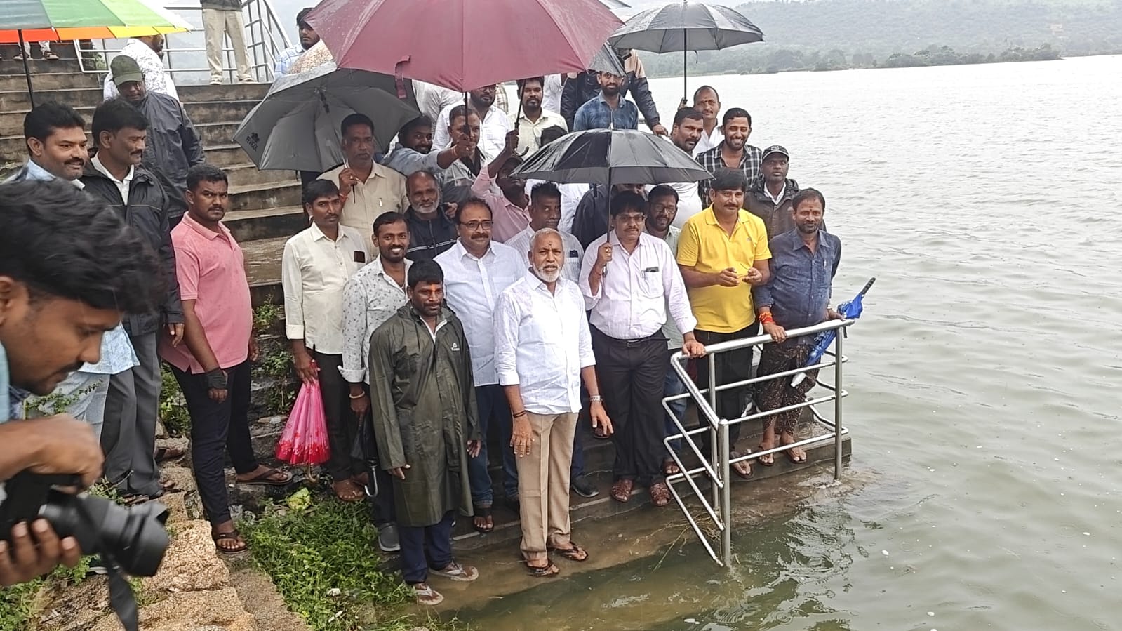 నేటి సాక్షి తిరుపతి (బాదూరు బాల)ముంథాన్ తుపాను వల్ల రాయల చెరువుకు ఎటువంటి ప్రమాదం లేదని సురక్షితమైనని చంద్రగిరి ఎమ్మెల్యే పులివర్తి నాని అన్నారు మంగళవారం ఆర్డీవో రామ్మోహన్ తో కలిసి రాయల చెరువులో నీటిమట్టాన్ని , గుర్రప్ప తూము, మిద్దె పైకి వెళ్ళి చెరువును పరిశీలించారు చెరువు గట్టు పై ఉన్న ముళ్ళపొదలును ఎన్ ఆర్ జి యస్ పనులు ద్వారా తొలగించాలని ఎపిఓ సుజాత ను ఆదేశించారు ముందుగా రామచంద్రపురం ఎస్టీ కాలనీలో తుఫానుకు పూరి గుడిసె పై విరిగిపడిన చెట్టు. పూరి గుడిసెలో ఎవరూ లేనందున ప్రమాదం తప్పింది. బాధితులను ఎమ్మెల్యే పులివర్తి నాని, అధికారులు నాయకులు పరామర్శించారు. బాధిత కుటుంబ సభ్యులకు తక్షణ సహాయం అందజేయాలని అధికారులను ఆదేశించారు. ఎన్టీఆర్ హౌసింగ్ స్కీం ద్వారా పక్క గృహాన్ని మంజూరు చేయించాలని హౌసింగ్ ఏఈని ఆదేశించారు అనంతరం కాలేపల్లి చిత్తూరు గ్రామాలను సందర్శించారు ముంపు గ్రామాల రైతులతో ముఖాముఖి మాట్లాడారు చిట్టతూరు మహిళలు గత ఆరు నెలలుగా మంచినీటి సమస్య ఎదుర్కొంటున్నామని ఎమ్మెల్యే దృష్టికి తీసుకువచ్చారు స్పందించిన ఎమ్మెల్యే అధికారులతో చర్చించి రెండు రోజుల్లో మంచినీటి సమస్యను పరిష్కరిస్తామని మహిళలు హామీ ఇచ్చారు.పిల్లారి కోన చెరువును సందర్శించి అధికారులతో కలిసి ఎమ్మెల్యే జల హారతి ఇచ్చారు రైతుల సమస్యలను అడిగి తెలుసుకున్నారు ఈ కార్యక్రమంలో రాయలచెరువు నీటి సంఘం ఉపాధ్యక్షులు త్యాగరాజులు మండల పార్టీ అధ్యక్షుడు మేకల తిరుమల రెడ్డి సీనియర్ నాయకులు చిన్నబాబు, తానికొండ కేశవులు నాయుడు, కొట్టే నరసింహారెడ్డి, కొట్టే గిరిధర్ రెడ్డి ,కోరాహరి ప్రసాద్ , పసుపులేటి విజయ కుమార్, లెక్కల సురేంద్ర ,తానికొండ రెడ్డప్ప నాయుడు, కొల్లం గుంట ముని రామిరెడ్డి,కొట్టే ధనుంజయ రెడ్డి,డి హరిప్రసాద్ ,కోటేశ్వర్ రెడ్డి, చెరుకూరి రవి, కొడవటిగంటి జగదీష్, రమేష్ రాయలు, సాయి ప్రతాప్, కమలాకర్ రెడ్డి, విజయ కుమార్ రెడ్డి,ఎమ్మార్వో మధుసూదన్ రావు, ఇరిగేషన్ ఎఈ ఎత్తిరాజులు,ఇంచార్జి ఎంపిడిఓ శ్రీనివాసులు, మండల వ్యవసాయ అధికారి మమత,ఎపియం గురుమూర్తి, ఎలక్ట్రికల్ ఎఇ గిరిధర్,ఎపిఓ సుజాత, తదితరులు పాల్గొన్నారు