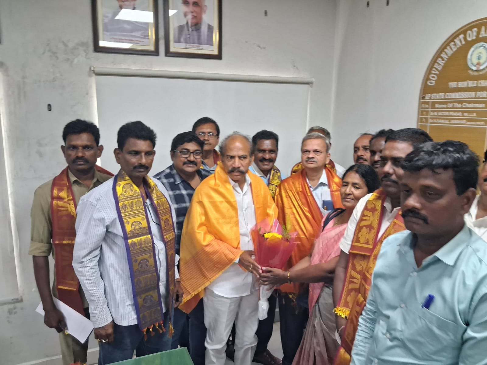 **నేటి సాక్షి తిరుపతి రాష్ట్ర ఎస్సీ కమిషన్ చైర్మన్ జవహర్ ను మంగళవారం ఆర్టీసీ ఎస్సీ ఎస్టీ వెల్ఫేర్ అసోసియేషన్ ఫౌండర్ మెంబర్ అంబేద్కర్ స్టార్ కృష్ణ, ప్రెసిడెంట్ రాజ్యలక్ష్మి, జనరల్ సెక్రెటరీ ఏ.వి.రాజు ఆధ్వర్యంలో ఆంధ్రప్రదేశ్ రాష్ట ఎస్సీ కమిషన్ చైర్మన్ జవహర్ ని మర్యాద పూర్వకంగా కలసి పుష్పగుచ్చం అందజేసి శాలువాతో సత్కరించి నూతన సంవత్సర శుభాకాంక్షలు తెలియజేయడం జరిగింది. ఈ సందర్భంగా స్టార్ కృష్ణ మాట్లాడుతూ ఇప్పటికీ సమాజంలో ఎస్సీ లపై దాడులు, దౌర్జన్యాలు జరుగుతున్నాయని, వాటిని అరికట్టడానికి మరింత కఠినతరమైన చట్టాలు తీసుకొనివచ్చి, ఖచ్చితంగా అమలు జరిగేటట్లు చూడాలని కోరారు. ప్రెసిడెంట్ రాజ్యలక్ష్మి, జనరల్ సెక్రెటరీ ఏ.వి.రాజు మాట్లాడుతూ ఆర్టీసీ ఎస్సీ ఉద్యోగుల సమస్యల పరిష్కారం కొరకు ఒక సమావేశాన్ని ప్రత్యేకంగా ఏర్పాటు చేయాలని కోరగా అందుకు చైర్మన్ జవహర్ గారు సానుకూలంగా స్పందించి తప్పనిసరిగా త్వరలో సమావేశం నిర్వహిస్తామని హామీ ఇచ్చారు. ఈ కార్యక్రమంలో అసోసియేషన్ వర్కింగ్ ప్రెసిడెంట్ జె.వి.రావు, అడిషనల్ జెనరల్ సెక్రటరీ ఆర్ ఎస్ రావు, సీనియర్ నాయకుడు శాంసన్, ట్రెజరర్ కోటయ్య,ప్రచార కార్యదర్శి అనిల్,తిరుపతి జిల్లా నాయకులు అంజప్పా, వాసు , పెద్ద సంఖ్యలో నాయకులు పాల్గొని నూతన సంవత్సర శుభాకాంక్షలు తెలియజేశారు. అనంతరం కడప ఎక్జిక్యూటివ్ డైరెక్టర్ పైడి.చంద్రశేఖర్ ని కూడా శాలువాతో సత్కరించి నూతన సంవత్సరం శుభాకాంక్షలు తెలియజేశారు