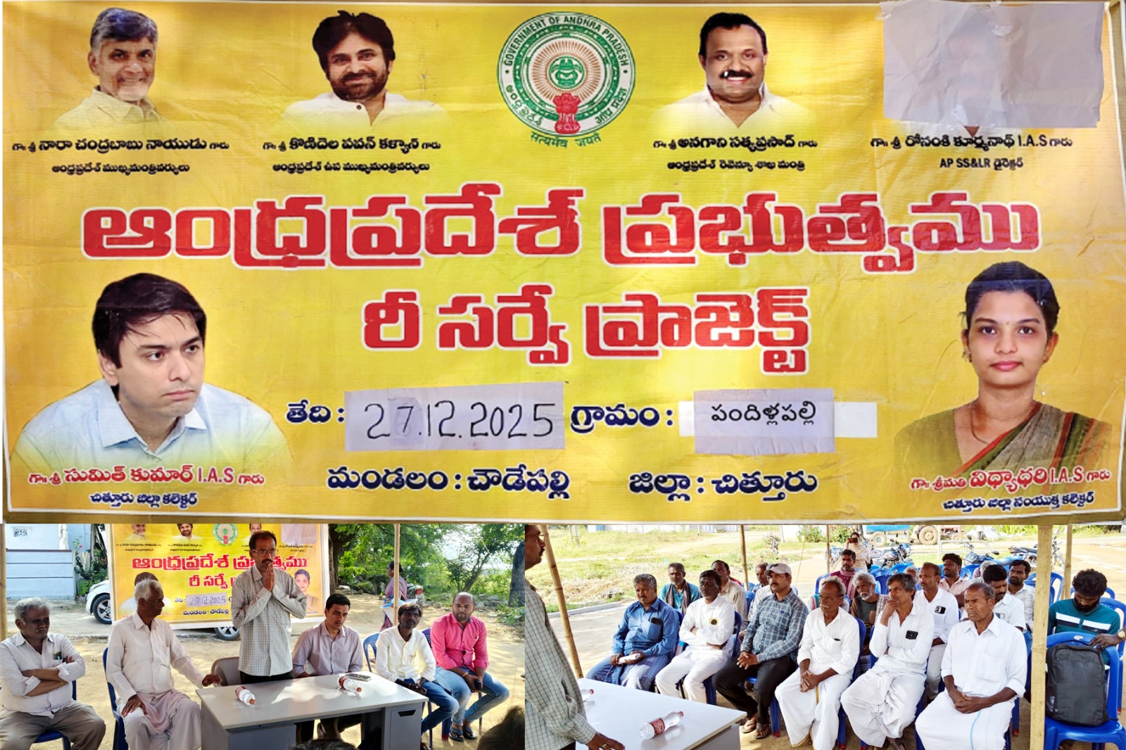 నేటి సాక్షి న్యూస్ చౌడేపల్లి డిసెంబర్ 27 ఆంధ్రప్రదేశ్ ప్రభుత్వం ప్రతిష్టాత్మకంగా చేపట్టిన భూముల రి సర్వే ను అధికారులకు రైతులు సహకరించాలని తెలుగుదేశం పార్టీ యువ నేత మాదిరాజు ప్రదీప్ రాజు అన్నారు శనివారం మండలంలోని పందిళ్ళపల్లి పంచాయతీ బాలసముద్రంలో రి సర్వే పై గ్రామసభ నిర్వహించారు ఈ సందర్భంగా ఆయన ప్రసంగిస్తూ ఇప్పటివరకు గ్రామాలకు సంబంధించిన బౌండరీల రీ సర్వే జరిగిందన్నారు వచ్చే జనవరి 2 నుంచి రైతుల భూములకు సంబంధించిన సర్వే ఉంటుందన్నారు రైతులు తమ రికార్డులను తీసుకొని భూముల రిసర్వ్ కి వచ్చే అధికారులకు సహకరించాలని కోరారు అనంతరం ప్రభుత్వం చేపట్టిన పలు అభివృద్ధి కార్యక్రమాలను గురించి వివరించారు ఈ కార్యక్రమంలో రెవిన్యూ అధికారులు గ్రామస్తులు పాల్గొన్నారు
